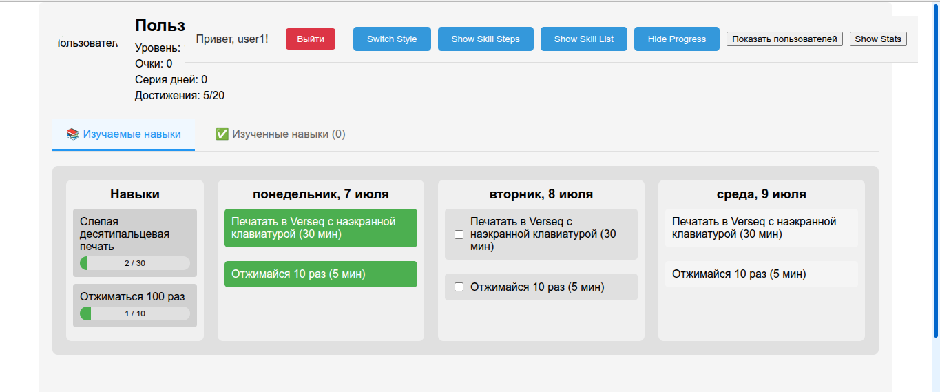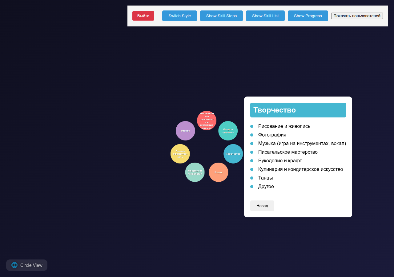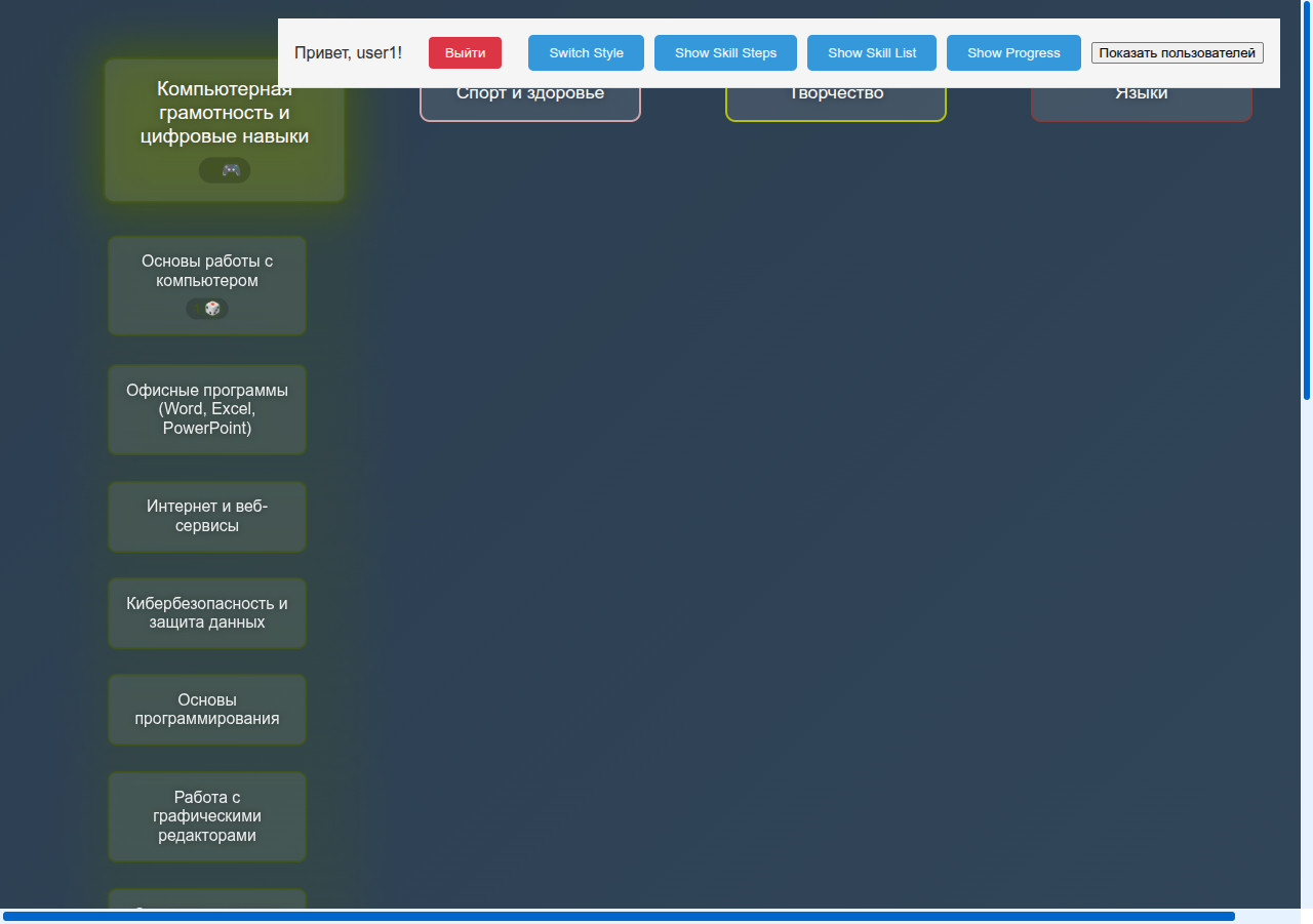 Все навыки разбиты на разделы и подразделы. Упор сделать на обучение без платы за курсы, информация должна быть в бесплатном / условно-бесплатном доступе. Будут элементы геймификации - очки, ачивки, счётчик дней без пропусков и тд. Комментарии под каждым путём, список изученных тобой/другим человеком навыков по категориям.