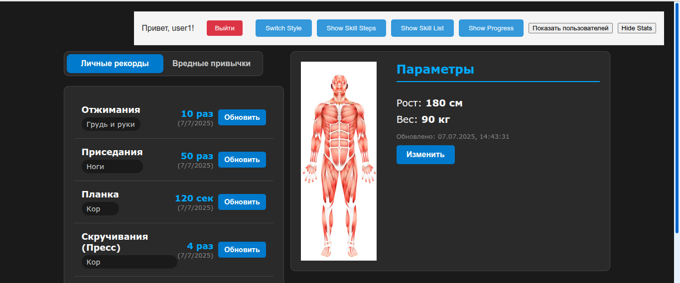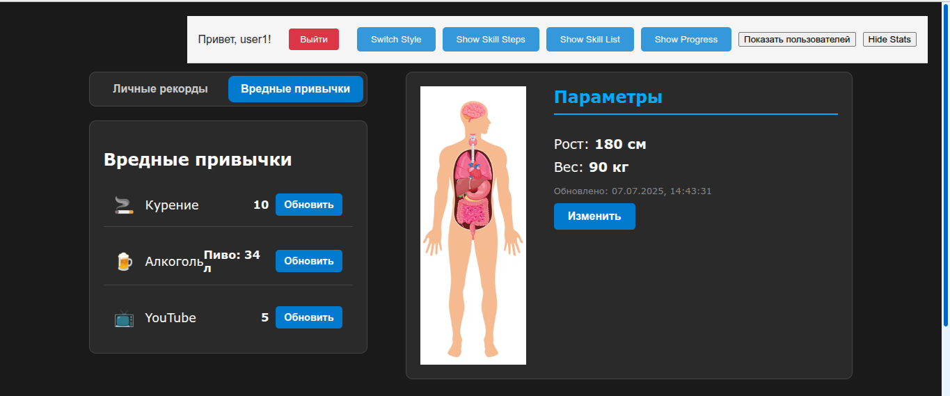 Skill Paths Сделал отдельную страницу с характеристиками - оценка физической силы и вредными привычками. По задумке - соответствующие мышцы будут окрашиваться более зелёным, чем больше повторений можешь сделать. То же самое и с вредными привычками - чем больше выкурил в день тем чернее лёгкие, алкоголь - печень. Нужно ещё график будет по дням выводить по этим данным внизу страницы.