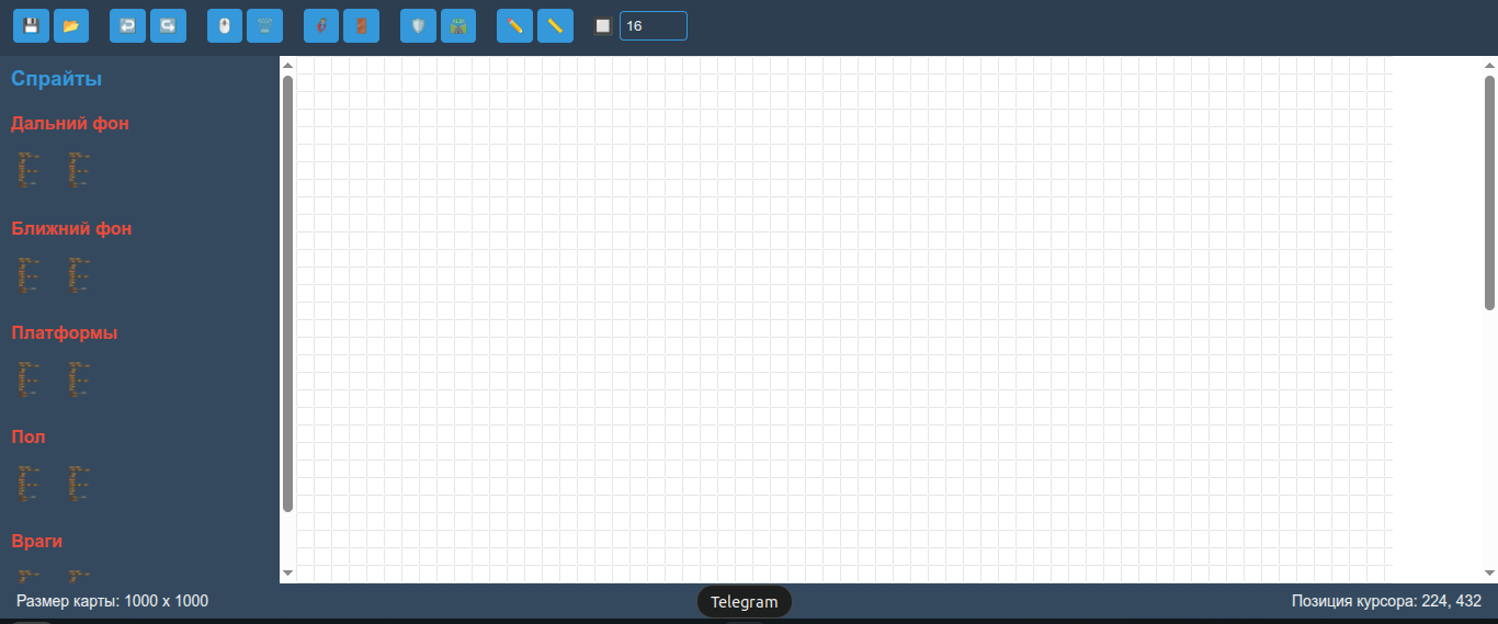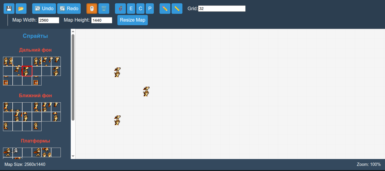 Теперь можно рисовать карту, ставить платформы, добавлять персонажа, ходить и прыгать на созданной карте. На пиках первый уровень из Chip and Dale 2, по которому ходит Чёрный Плащ.