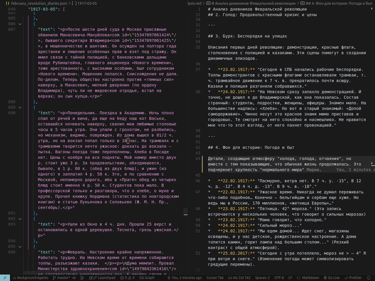 Книга Мой друг начал писать книгу про попаданца который садится в автобус в нашем мире и оказывается в другом. Он написал пару страниц и забил, а сегодня скормил свой текст Gemini и попросил продолжить. А мне понравился результат. Я попробовал сам в Курсоре. В отдельных файлах сделал характеристики персонажей, описание локаций, описание стиля текста, структуру сюжета. Местом действия выбрал Петербург 1917 года (без попаданцев). Вытащил дневники за февраль того года с сайта Прожито. Нейронка выделила из этих текстов погоду, описания мест, настроения в городе. Погенерил пол-вечера и наскучило. Попадались логические ошибки, фразы, которые не используют в русском языке, клише. Конечно, можно всё это настроить в единую систему файлов и промптов, которая будет выдавать книги по штуке в день. Уверен, что многие уже так делают.