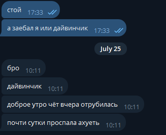 Отчет за 27.07.25 Тоже нихуя не делал, вплоть до того шо на велике не выходил катнуть, играл в доту, смотрел ютуб много и вот ща сажусь на полчаса. Завтра на работу, чета западло 3 дня работать до отпуска