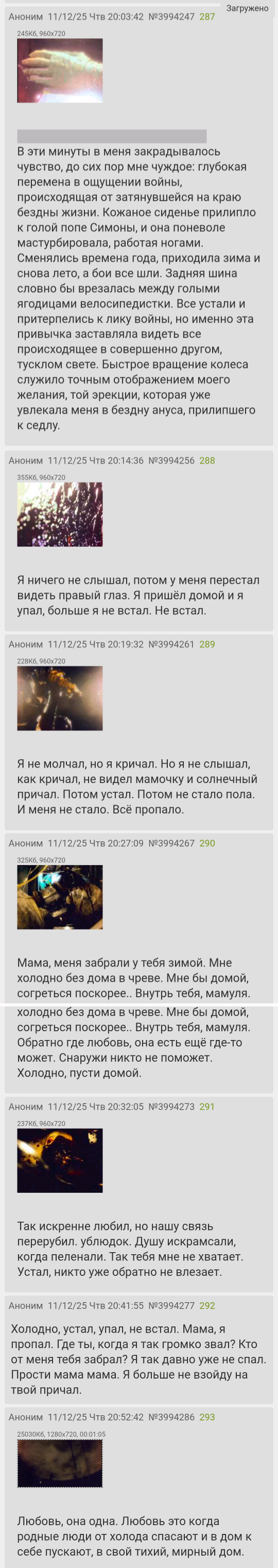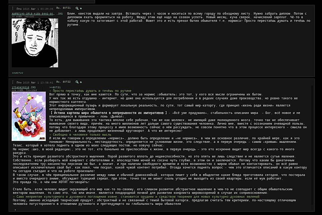 >>818523 >Алсо, в /dr можно было высказываться на общественно значимые темы вплоть до конца 2023го года. Нет. За упоминание рдк начали банить ещё в 2022. Кто-то может сказать "так это террористы, ясен хуй за это банить нужно". Вот только по такому же принципу можно начать банить вообще любую точку зрения. Путём отбора, единствеными либерахами оказываются зрители каца. Если уж выбирать между кацем и путиным, то путин явно пизже будет. Таким образом самый адекватный анон в 2к25 - это ватник-людоед который скандирует "резать xoхлов". Остальные аноны это как раз образ ещё большего неудачника как в посте >>818575 . "Навредить всем кто хоть что-то из себя представляет" - это только лайтовая версия неудачника. Прожжённый червепидор скорее будет выглядеть как буддист-стоик, который в общем то и вредить никому не хочет, вся его деятельность является подневольной. Мораль червепидора заключается в полном недеянии. Обычный человек мыслит в категориях классической морали, согласно которой смерть с оружием в руках - это подвиг. Лайтовый неудачник искривляет немного мораль, и считает что вот "умереть на войнушке пушечным мясом - это глупо..." а вот сдохнуть от спида, долбясь в попу с узбеками это вприципе норм. Это ещё не такой плохой вариант, во всяком случае все мы не из окопа капчуем. Самый хуёвый вариант это отказ от любой деятельности: "война - для дураков, ебаться в жопу - пидорство, работать - для рабов, отношач - для быдла, деньги - не главное, месть - это глупо, конкуренция - для дураков". Такой лох не способен открыто ненавидеть, скорее он будет хлопать глазами и говорить что всё хорошо. Поддержка власти со стороны червепидора мотивируется не авторитетом и уважением, и даже не ненавистью к оппозиции, а банальным смирением, и привычкой прислуживаться вообще всему что находится поблизости. Очевидно, такие люди есть в любой стране, Для сравнения, отморозок-зек из тюрьмы более честен и глубок в своих мотивациях, чем рядовой двачер-нетакусик. У зека мотивация честная - он не хочет терпеть пизюли на нарах, он хочет выйти на свободу побухать, поворовать. Поэтому двач - клоака, где не может быть нормального общения. Сколько не юродствуй, а нормальное общение может быть только вне стагнирующих платформ. В тот же telegram и discord хлынуло много народа, когда там модерации не было.