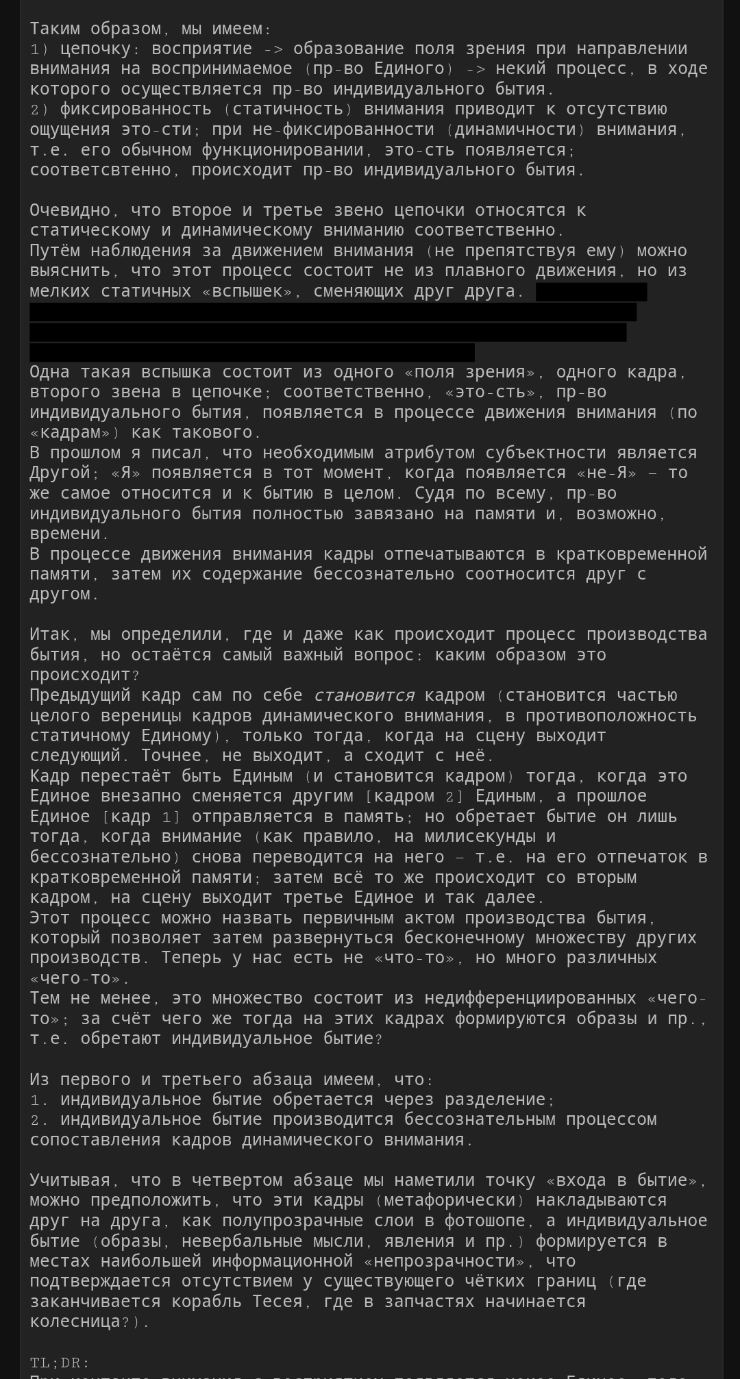>>805584 >Меня банят за то что я имею своё мнение и существую как субъект а не объект, обладаю своими уникальными мыслями и идеями которые могут вступать в противоречие с общепринятыми ценностями. Пресекаю ложь в отношение чего-либо и в целом у меня есть принципы и мечты. Это собирает много репортов, но и мне даёт повод задуматься о том, почему так. Ведь проблема не во мне, а в обществе. Любою интернет-площадку я вижу типа как поля боя в некоторой игре, в которой мне присвоены изначально некоторые типа Жетоны-на-правду, в пределах которой я могу писать правду, ну, тупо излагать унылые фактические факты суровой реальной реальности. Например, что Белорусская ССР не выходила из состава СССР — очевидный и легко и приятно проверяемый фактический факт реальной реальности. Некий ограниченный набор Жентонов-на-правду позволяющий сообщить некие известные и очевидные факты, по исчерпанию же оного лимита — неизбывное банирование. Этих Жентонов-на-правду примерно 1,5...5% от необходимого количества отпущено в зависимости от площадки.