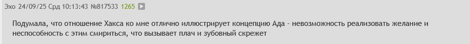 Подумал, что отношение Алкоголика ко мне отлично иллюстрирует концепцию Ада - невозможность реализовать проекцию и неспособность с этим смириться, что вызывает плач и зубовный скрежет