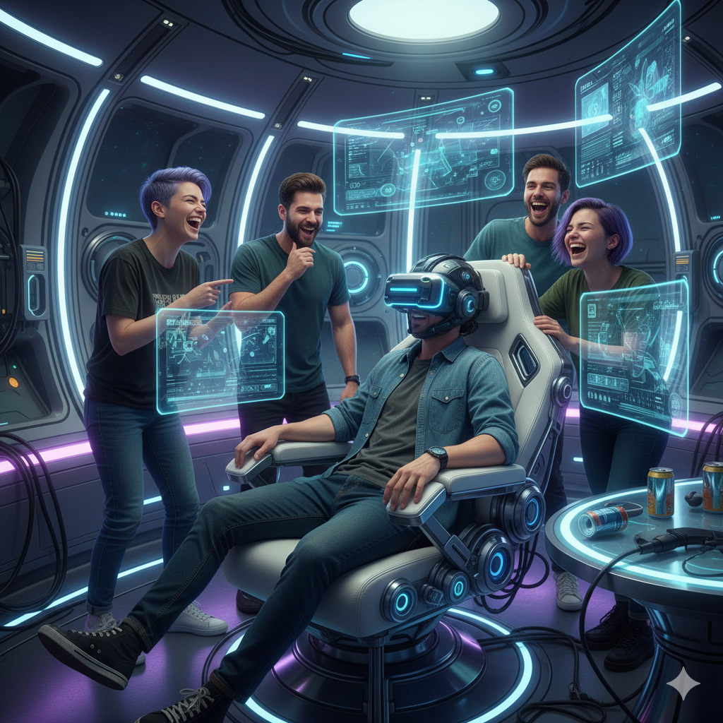 Внезапно ты просыпаешься в какой-то хай-тек комнате на голове у тебя шлем виртуальной реальности, лежишь на каком-то кресле и вокруг тебя смеются друзья.
