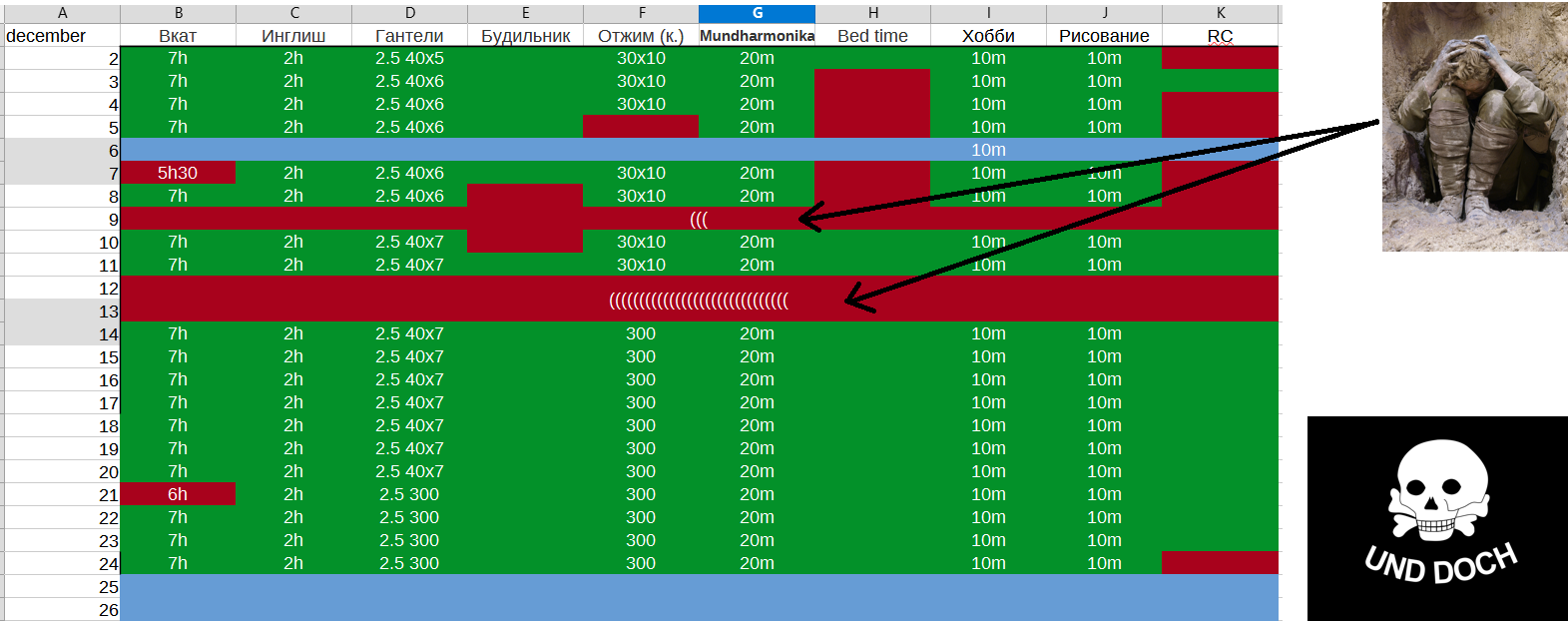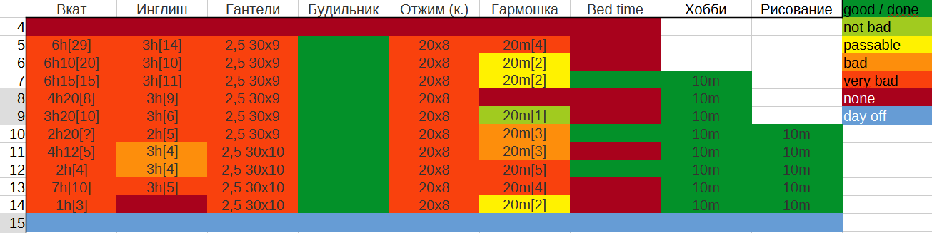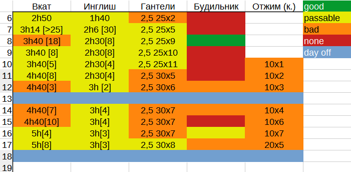 Теперь в дальнейшем будут следовать: англейский, вкат, физические упражнения и подъем по будильнику. Хотела поднимать 10 килограмм 100 раз одной рукой к ноябрю, но такого веса не оказалось, есть только семь, так что 7 килограммов к ноябрю одной рукой 100 раз