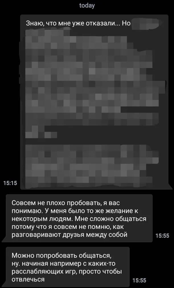 Сейчас у меня есть человек, который меня нравится, но я боюсь показывать свои чувства, пока мне не станет очевидно, что они не будут лишними. Сейчас они будут лишними. Я хорошо понимаю других людей и знаю, когда лишние слова будут только мешать. Если ничего не получится — я тоже не буду грустить, такое бывает.
