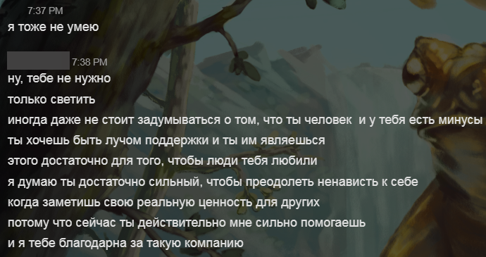Охуеть, мой учитель мне написала и снова научила мудрости и дала веры в себя. Между нами всего год жизни разница, но у меня такое чувство, что я никогда не смогу быть таким же мудрым, как она.