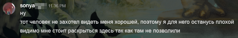 Единственное, что мне нужно в этой жизни — это общение с другими людьми. Критическую важность имеет наличие в моей жизни фп, по которому я могу сходить с ума и стараться ради существования этого человека. Вся моя жизнь становится зеркалом желаний этого человека. Меня это устраивает. Мне нравится так жить. Я делаю кого-то счастливым и это счастье становится моим счастьем. Такое существование - моё счастье. Но со всеми моими последними фп всё было очень плохо. Просто и я, и они, друг другу не подходили в базовых моментах — такое бывает. Я не грущу по этому поводу.