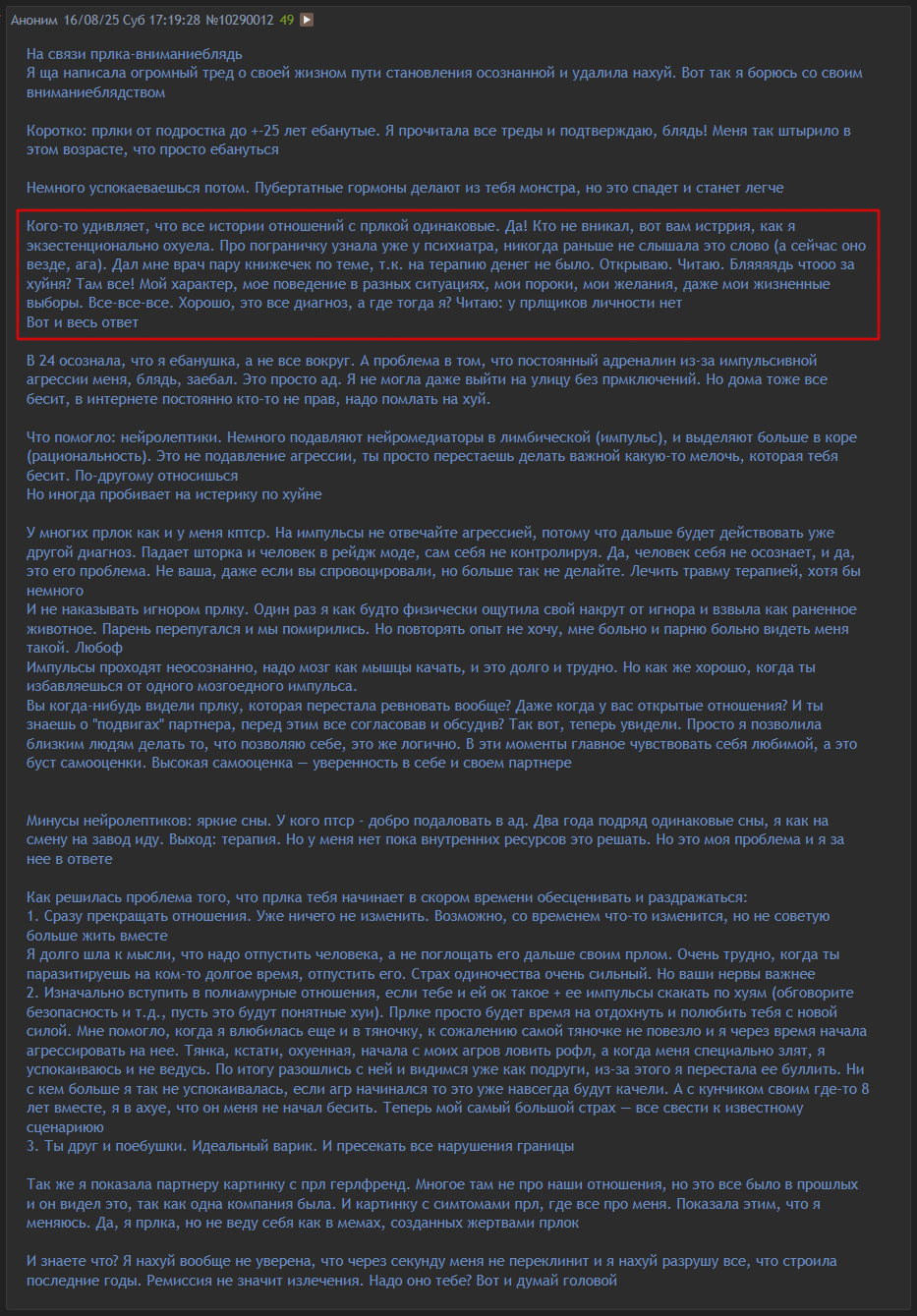 Эти посты иллюстрируют не конкретное событие, вроде «подрочить под спидами», а такой общий BPD symptom, как Chaotic Relationships. Про «600к» может и не быть правдой, это ещё одна черта, которую ОП у себя... кстати, потенциально упомянул: >Лживый >Фрагментарная память но никак не иллюстрировал: «переписывание истории [любви, чтобы убедить себя, что ты белый и пушистый, а вокруг мрази, норовящие тобой воспользоваться, но ты их переиграл, воспользовался сам, и вообще только выиграл]». Он вроде как, наоборот, может позволить себе прямо говорить: «меня опять бросили, потому что я мудак» тут одно из трёх: либо он просто про это не рассказал, либо ему это реально не надо, либо ему это пока не надо: вряд ли таинственный мистер Y в возрасте ОПа сильно много понапереписывал. Я не считаю всё это существенными отличиями, меняющими суть Chaotic Relationships.