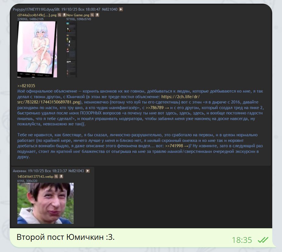 Это самый безобидный момент без явного стремления меня обосрать (в отличие от последующих), человек по сути просто эмоционально выразился (по крайней мере можно так интерпретировать), но задним числом уже как-то неприятно. Если же на тупорылых дрочеров пытаться отвечать... Ну вот я Хаксплаксу однажды на выпад, по формальному содержанию уже близкий к трапу в боевом кураже, ответил вторым видео, он и Ария ответили, что ну и мерзость, он же пошутил, ну и всё на этом, помахались и разошлись. Это нормальная реакция. У Юмасика при попытке, даже не как-то так симметрично ответить, а просто что-то пискнуть против, происходит то, что описано на этой картинке: https://2ch.life/dr/src/815928/17593477825711.png, в абзаце, начинающемся с «у многих прлок, как и у меня, кптср, на импульсы не отвечайте агрессией...». Ну блин, идея хорошая, только я ещё по воде ходить не умею и воду в вино превращать тоже.