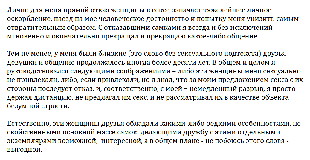 >>822955 >Столько раз тот пытался найти себе девушку. Ты чё, охуел. Как насчёт 0? Мне нравилась одна девочка 11 лет назад (тоже уже 10 раз рассказывал), но и с ней я по сути обращался как с парнем и меня сильно разозлило, как на моё обычное тогда действие (добавить человека в СП вконтакте) она отреагировала не как парень.