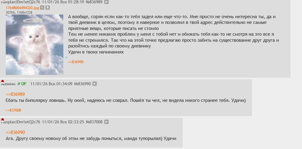 Из последнего разве что на девчонку из другого дневника немного быканул но честно говоря мне кажется что там какая то тупая манда которая пришла на доску за валидацией своих проблем поэтому это не считается