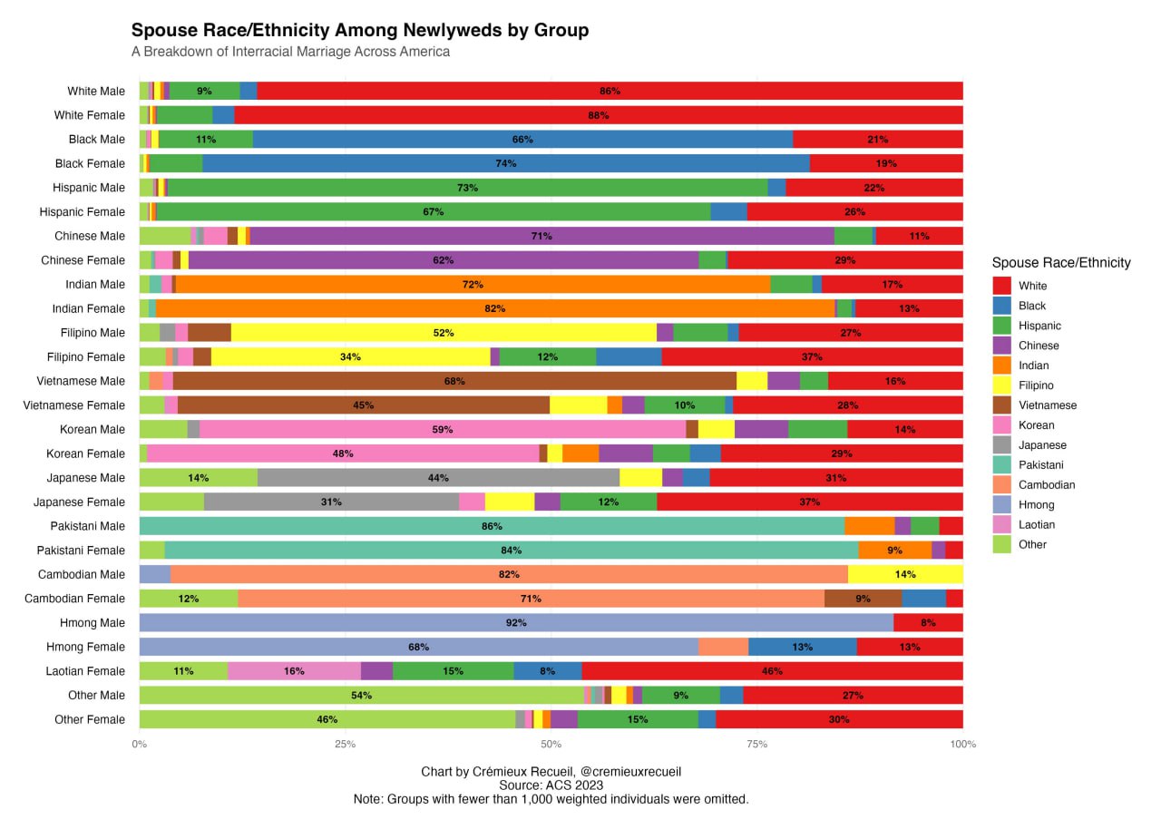 3 процента белых женин выходят замуж за негров, 2 процент белых мужчин берут в жены негритянок. С латиносами более мощные проценты 7 процентов бряков у белых женщин, и 9 процентов браков у белых мужчин