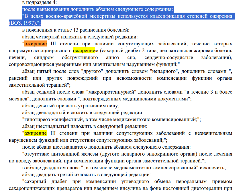 Когда этот законопроект примут, то на категорию В должна быть 3 степень ожирение по ВОЗ, то есть ИМТ 40 и выше. Для категории Д - ИМТ 40 и выше при наличии сопутствующих тяжелых заболеваний.