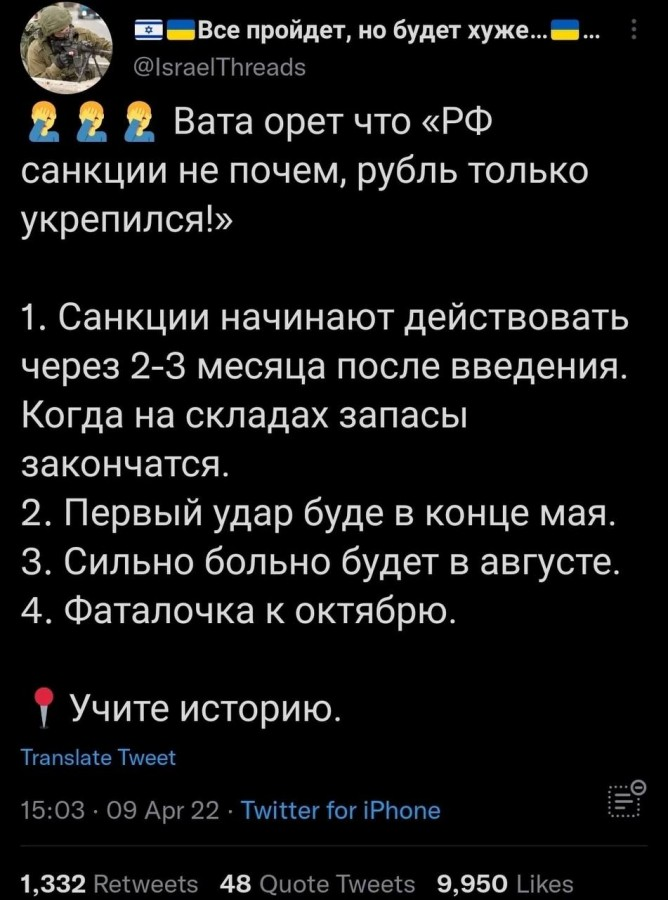 >>1198383 Тут соглы. Вообще, мне кажется, примером армии здорового человека могло бы быть то, что было у меня на сборах после военки, просто растянутое на год. Нас никто не пиздил, не оскорблял персонально. Мы почти не занимались херней, даже тупого физического труда было не особо много, да и он, в принципе, был связан со специальностью (типа оборудования КНП, опорника и т.п.). При этом за те 5 недель мы по 3 раза стреляли из калаша, ПМ, РПГ, дважды выезжали на полигон с нашей артой на стрельбы. Прокачка физухи, марш-броски, много решали теоретических задач. В общем-то насыщенно и толково, тем более, за такой срок короткий. Жаль, я не думал тогда, что такой "откос" от срочки добавит проблем в 22-м Единственное, что кормили дерьмово - кипяток с половиной картохи - это, типа, суп, на второе какой-то клейстер из риса/сечки, везло, если там была куриная кожа или даже ошметок из тушняка. Ну и дневальным быть не понравилось - скучно и тупо весь день как королевский гвардеец стоять. >>1198388 А что не так? У Израиля разумная дипломатическая политика. Он делает, по сути, то же самое, что и РФ, только за счет умного выбора союзников ему за это ничего не делают плохого (взвизги соевиков никого не волнуют). Плюс с демографией у них нет проблем. За счет ортодоксов, но как бы они являются таким резервуаром людей, ибо из их семей многие отпочковываются в обычных светских граждан. Вот у Светова как раз интересная мысль была, что и Россия могла что-нибудь подобное бы организовать, используя условных старообрядцев.