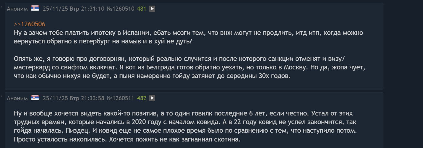 >>1260511 → >>1260510 → Отвечаю на этот ответ. Вы щас опять скажете какой я долбоеб и все такое. Ну первое я пиздец как наездился и даже сама мысль о переезде после стольких усилий со справками на справки вгоняет в ужас. Идея о том что надо ехать обратно с кошкой, со всеми пожитками. У тети Оли которя ненавидит переезды вообще кукушка нахуй отлетит. Да и у меня тоже. Как будто пройдено слишком много чтобы бросать. Уж лучше тут полочки прикручивать. Во вторых ну бля я в целом не хочу жить в питере на намыве. Не знаю где хочу в россии как будто только юг остается, но этот питер я рот его ебал. Намыв в частности с его вечной стройкой. Каждую зиму и осень я ждал момента чтобы оттуда сьебаться в тайланд. А возвращаясь унывал потому что еще три месяца терпеть пока лето придет. В третьих ну вот тут как будто жилищный вопрос проще закрыть. Я не хочу в рахе в еботеку влазить. Даже две третьих хаты оплатив я получу хуйню где жить то особо и не по кайфу будет с платежами еще по 200 к в месяц. Да нахуй надо. Уж лучше тут коробку взять под 2%. Мне в целом тут нравится природа, климат и нахождение вне дома тут мне приносит удовольствие. Вот все эти поездки на велики, шабление, сидение накуренным у моря. И это я еще тачку не купил. Океан, возможность там летом поехать в той же испании на моря это заебись. А в питере нормальной погоды 3 месяца в году и то с оговорками. По работе даже если они там чето подпишут со мной один хуй с рахи работать не будут по остаточному принципу. Щас доджат работу с русами и хохлами. У первых из за токсичности у вторых головняк с бусификацией работников и выключениями света. Проще и не связываться. Не то чтобы тут как то дохуя возможностей, но вернувшись в раху светит мне работа только на аутсорс галеры в рашке за бомжовый прайс. Но там и расходы ниже надо сказать. В пизду кароче. Я вообще хочу выкатиться нахуй с этого аутсорса и работать в девелопменте, а из россии это делать не получится. Ну и последнее. Мне не нравится идея вот этого "русского поля экспериментов". Это я успел хотя бы на жизнь какую то заработать, на халупу и опять сбрили жир. Каждые 5 лет новая хуйня. Новый кризис. Постоянно какие то социальные лифты в виде анальничества и вебкама выстреливают. То надо быть военным чтобы подняться, то комерсом, то юристом все шли, то блят экономистом. Мать у меня в совке на товароведа училась по настоянию родителей чтобы домой колбасу таскать с работы, а все в семье военные были потому что там пайка увеличенная и квартиры. Меня это заебало. Я просто хочу уже дожить жизнь без всей этой хуйни и многоходовочек. Но я уверен что я такой бедовый лох что попаду на экономический спад в европе и потом буду сидеть с себя проигрывать когда вот эта хуйня и ей подобные >>1260719 начнут европедирасиков ебать. И когда я буду ссылаться что в далеком 2010 году было в европе сыто и богато и я туда поехал потому что мне варламов мозги промыл то мне в 2040 будут говорить НЕ НУ ТО ВРЕМЯ ДРУГОЕ БЫЛО ПЫНИМАТЬ НАДО. А ебано будет везде. Просто этот разрыв между рахой и условной испанией сократится еще больше. И там и там на пенсию хуй пососешь или до нее не доживешь просто. И там и там работать до седых мудей. А выиграют те кто сейчас тут в испании доживают и на свою пенсию сидят вино пьют и отлетают в вальгалу доедая самую лучшую в европе медицину и прочую социалку. На счет договорняка. Я в него не 