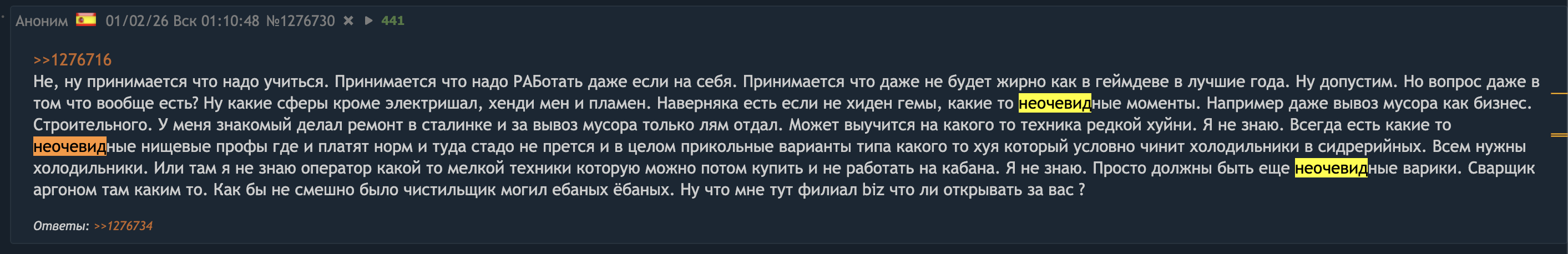 >>1276716 Не, ну принимается что надо учиться. Принимается что надо РАБотать даже если на себя. Принимается что даже не будет жирно как в геймдеве в лучшие года. Ну допустим. Но вопрос даже в том что вообще есть? Ну какие сферы кроме электришал, хенди мен и пламен. Наверняка есть если не хиден гемы, какие то неочевидные моменты. Например даже вывоз мусора как бизнес. Строительного. У меня знакомый делал ремонт в сталинке и за вывоз мусора только лям отдал. Может выучится на какого то техника редкой хуйни. Я не знаю. Всегда есть какие то неочевидные нищевые профы где и платят норм и туда стадо не прется и в целом прикольные варианты типа какого то хуя который условно чинит холодильники в сидрерийных. Всем нужны холодильники. Или там я не знаю оператор какой то мелкой техники которую можно потом купить и не работать на кабана. Я не знаю. Просто должны быть еще неочевидные варики. Сварщик аргоном там каким то. Как бы не смешно было чистильщик могил ебаных ёбаных. Ну что мне тут филиал biz что ли открывать за вас ?