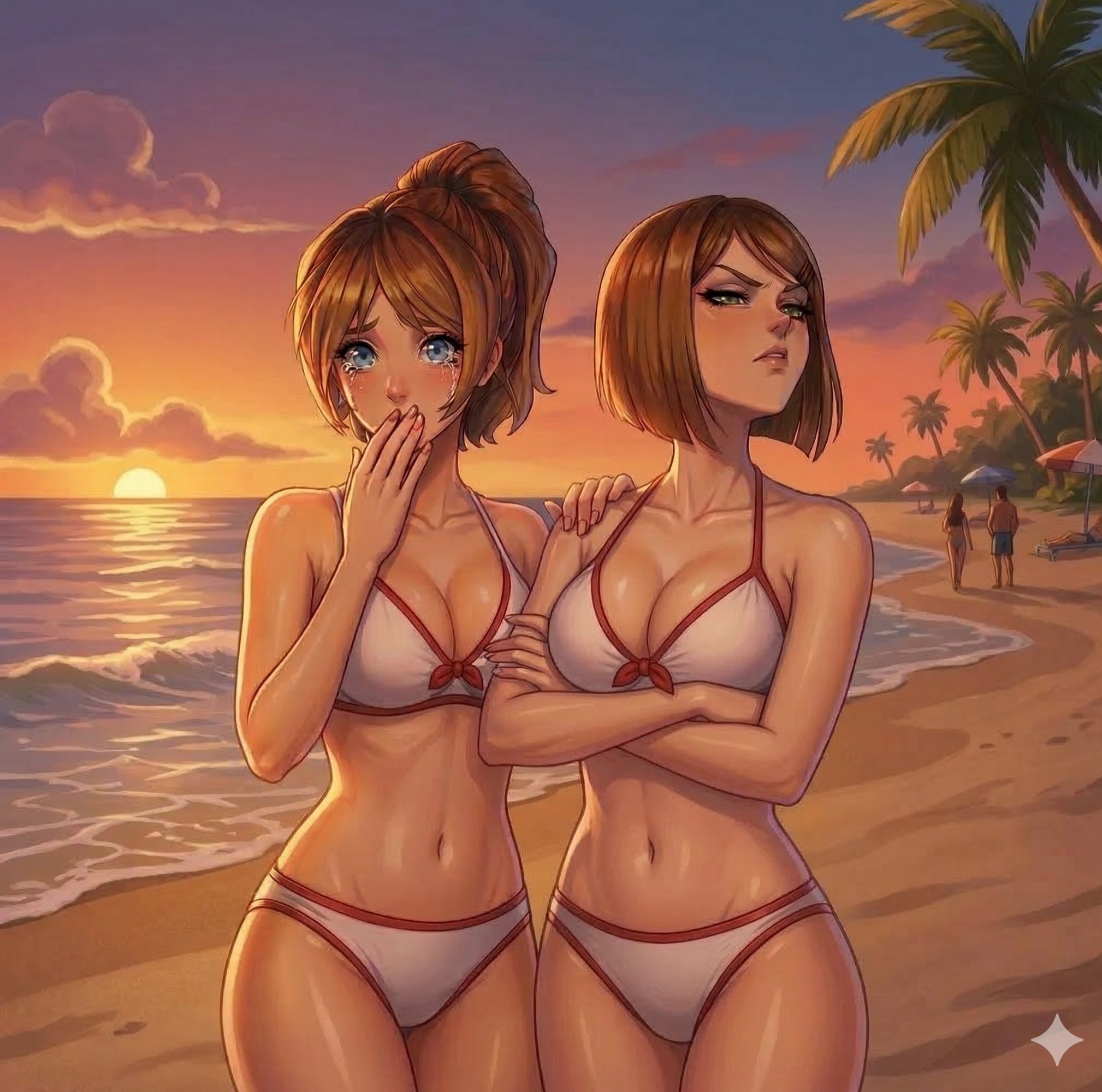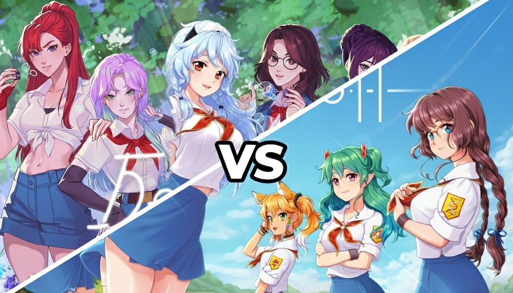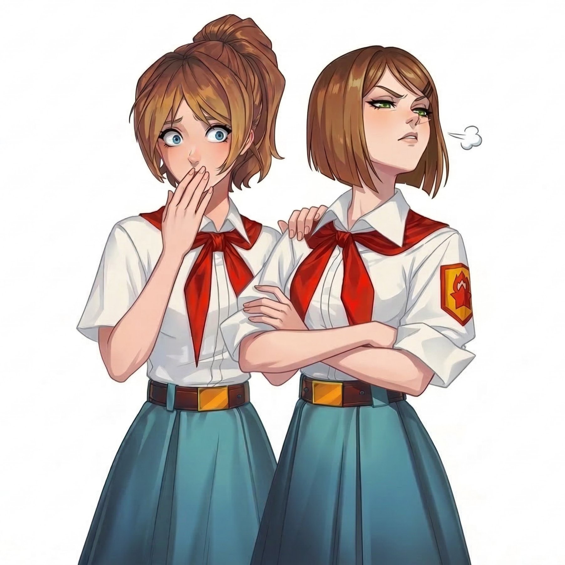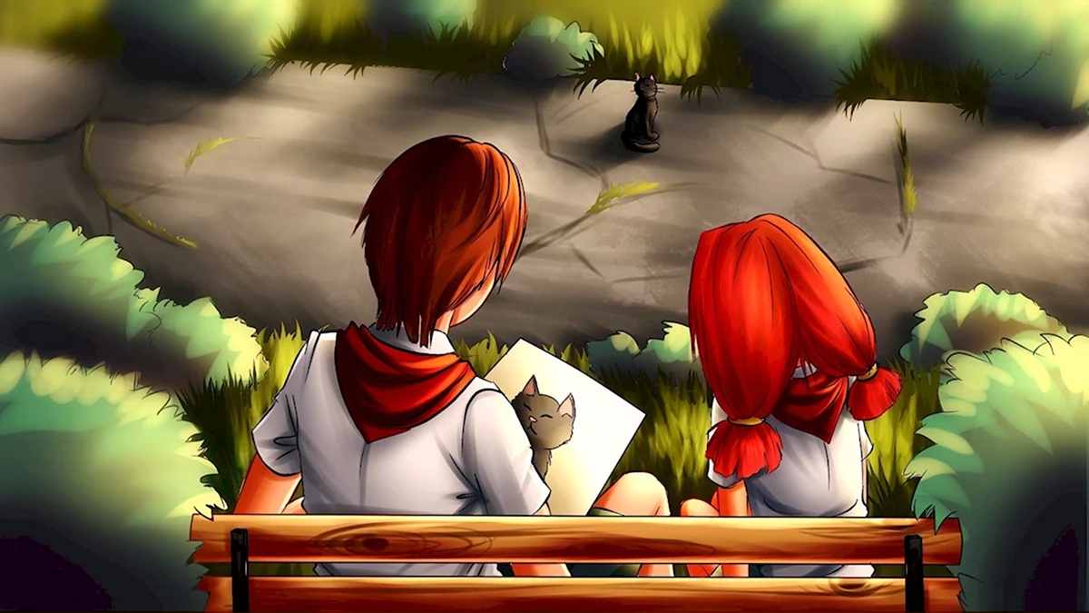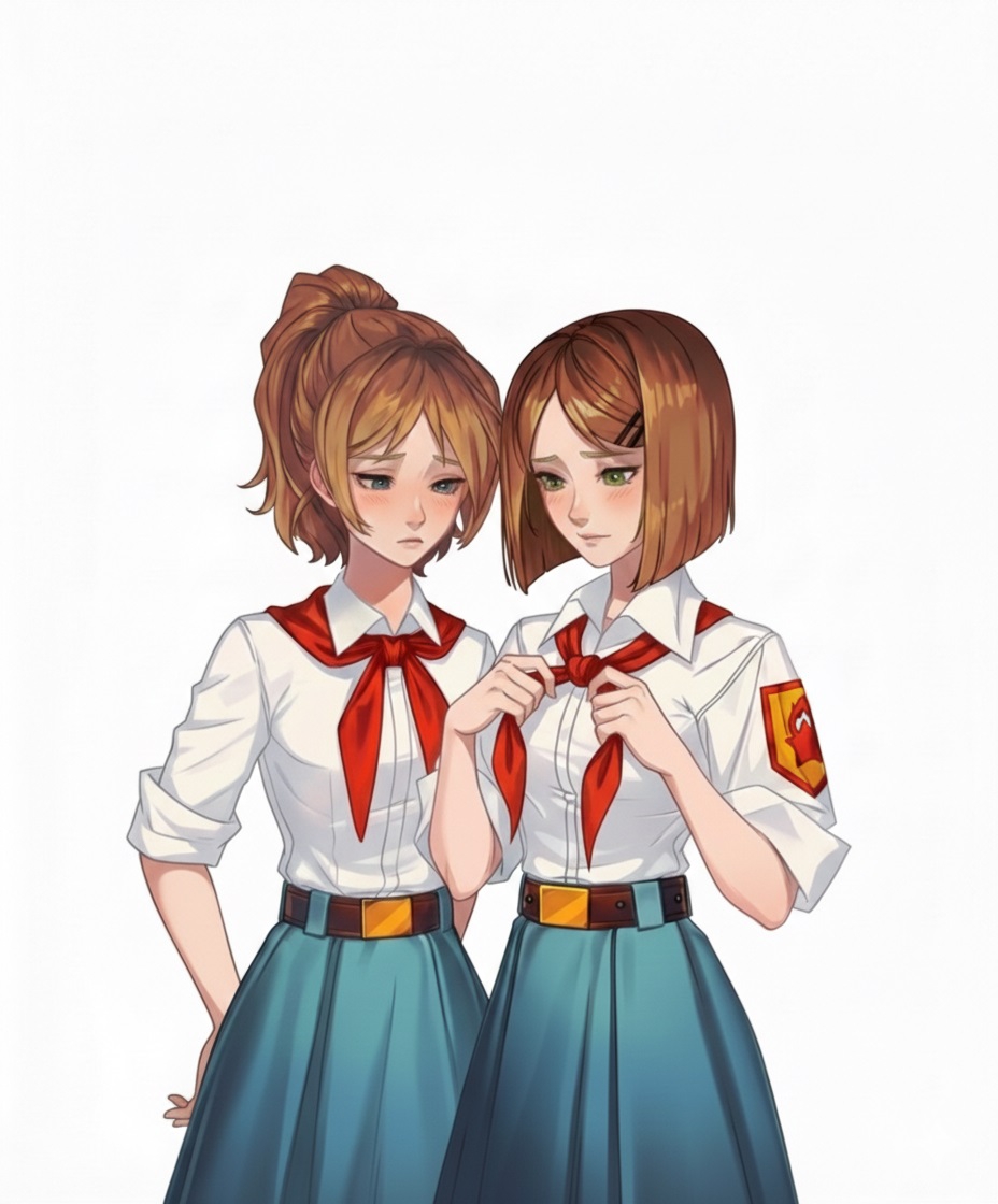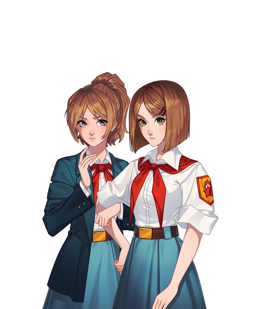 Это Соня и Настя, самые оригинальные пионерки Бесконечного Лета 2. Почему? Да потому что, на самом деле, это одна пионерка, которая при попадании в лагерь разделилась на две личности. (ну или еще есть версия, что это одна личность из двух параллельных вселенных, не суть).