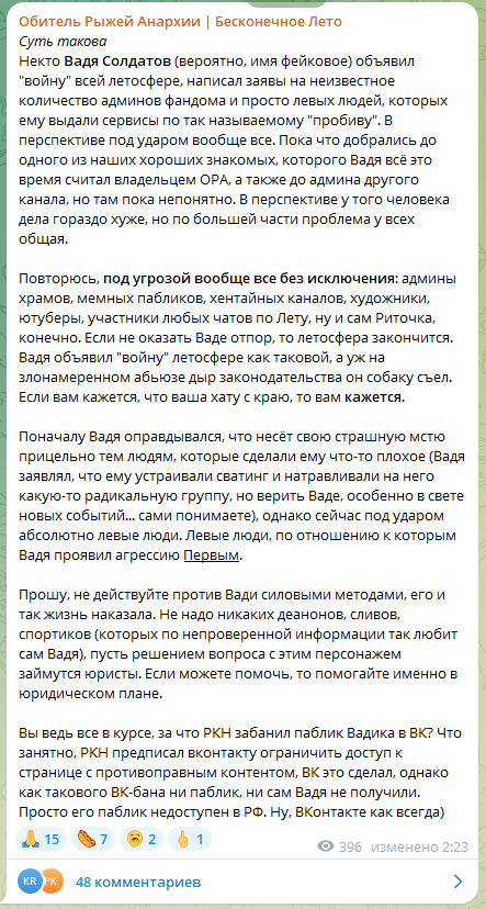 В ВКудахте есть паблик который только тем и занимается, что занимается травлей, угрозами и баном других групп по Бесконечному Лету. Уже несколько групп было забанено. На группы в целом относительно все равно, но он потом пойдет еще и дальше. Да и в целом группы все же привлекают больше народу к игре. А это дает приток нового творчества. Может жалобы на него накидаем как за травлю и буллинг?