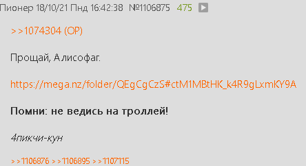 Кстати, архив-кун, отзовись. Гугл архивы сломаны, алисопак тоже, пастбин не обновляется с семидесятого треда. А то я че то очкую и боюсь что все потеряется.