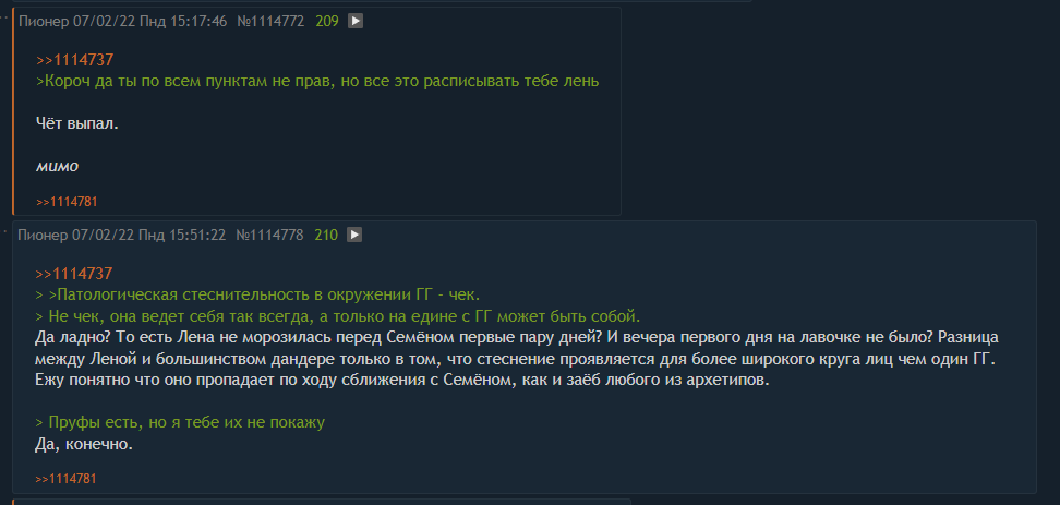 > либо которые были единожды и приписываешь это как пруф? Что значит "были единожды"? Если гипотетически Лена кого-то убьёт из ревности единожды, это тоже можно не считать? Алсо, о каких конкретно пунктах идёт речь? Наведи пример хотя бы. Ты ведь даже один не смог опровергнуть, тупо слился и начал жирнить своей кровищей.