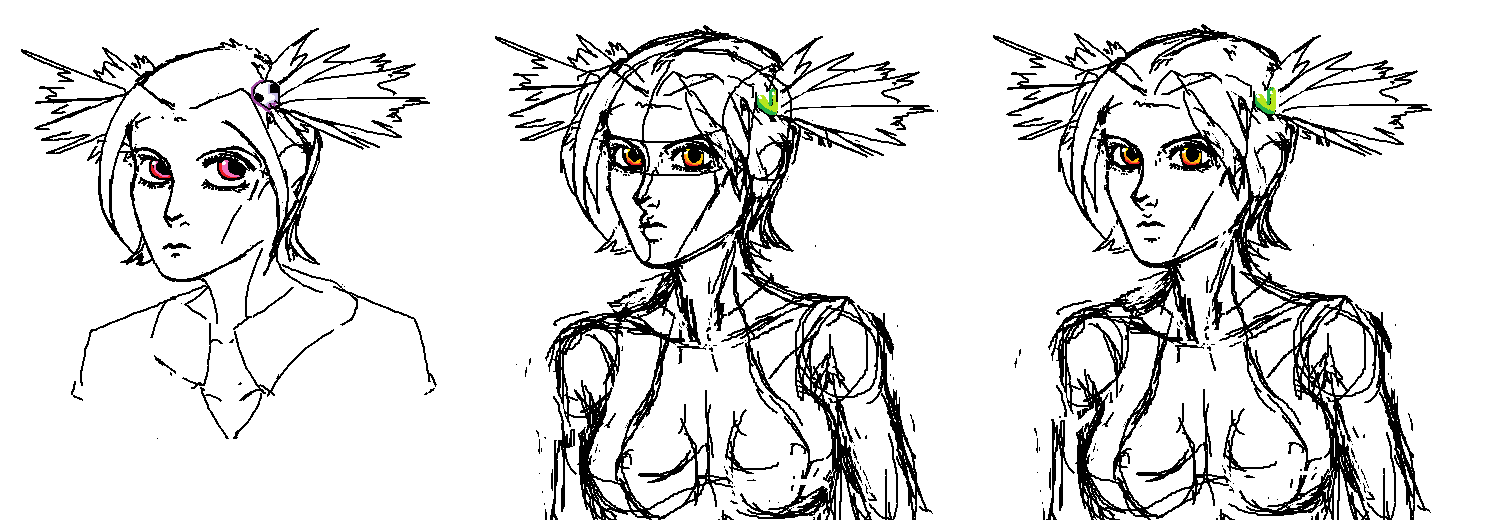 >>1145899 Положение уха мне совсем не нравится, плечо подправил и черту вдоль шеки закрасил. Так же прикрепить шею к голове надо чуть правее. Чёрточка на шее идёт от уха до центра схода ключиц, по мелочам чуть нос подрихтовал. Грудь чуть-чуть пониже. В общем уотакуот: