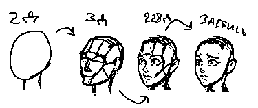 >>1147792 >>1147791 Вот так уот Сперва делаем двухмерный силуэт башки, тут не надо мыслить в трёх плоскостях. Потом начинаем резко мыслить в трёх плоскостях и добавляем этому силуету граней в соответствии с гранями 3д обрубовки. Далее стираем лишнее и опача, готово! Через какое-то время практики вы запомните эти грани и ваще будете ебашить головы без задней мысли.