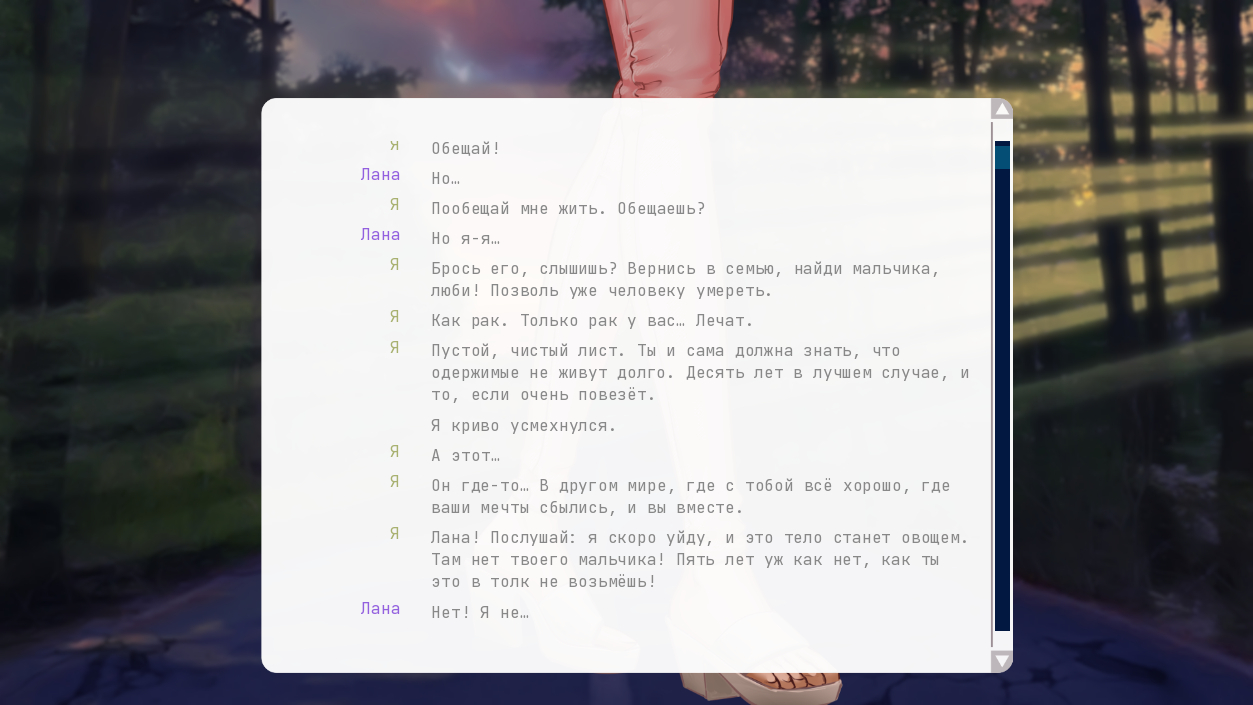 "Ты обещала меня встретить, помнишь?" "Обещала поймать меня из воздуха и не позволить мне исчезнуть." "Я ценю с твоих уст эту сладкую ложь. Непонятно так, жутко и странно — но ты ею как шрамами бережно шьёшь инфантильности рваные раны." "И стоило ли вспоминать?" "Стоило ли позволять исчезнуть одному из нас?" "За право однажды встретить тебя улыбкой узнавания." "Ибо нас всегда было двое. И одного безответно любила ты, а другой был влюблён в тебя до беспамятства." "И мы были разными людьми, из разных эпох, с разной памятью." "Так по какому праву мы судим, кому жить, а кому исчезнуть?" with fade2 "По праву памяти?" "Моя память содержит четверть века жизни кого-то, кем мог бы стать твой ненаглядный Сёмыч." "Или не мог бы — тут уж как карта ляжет."