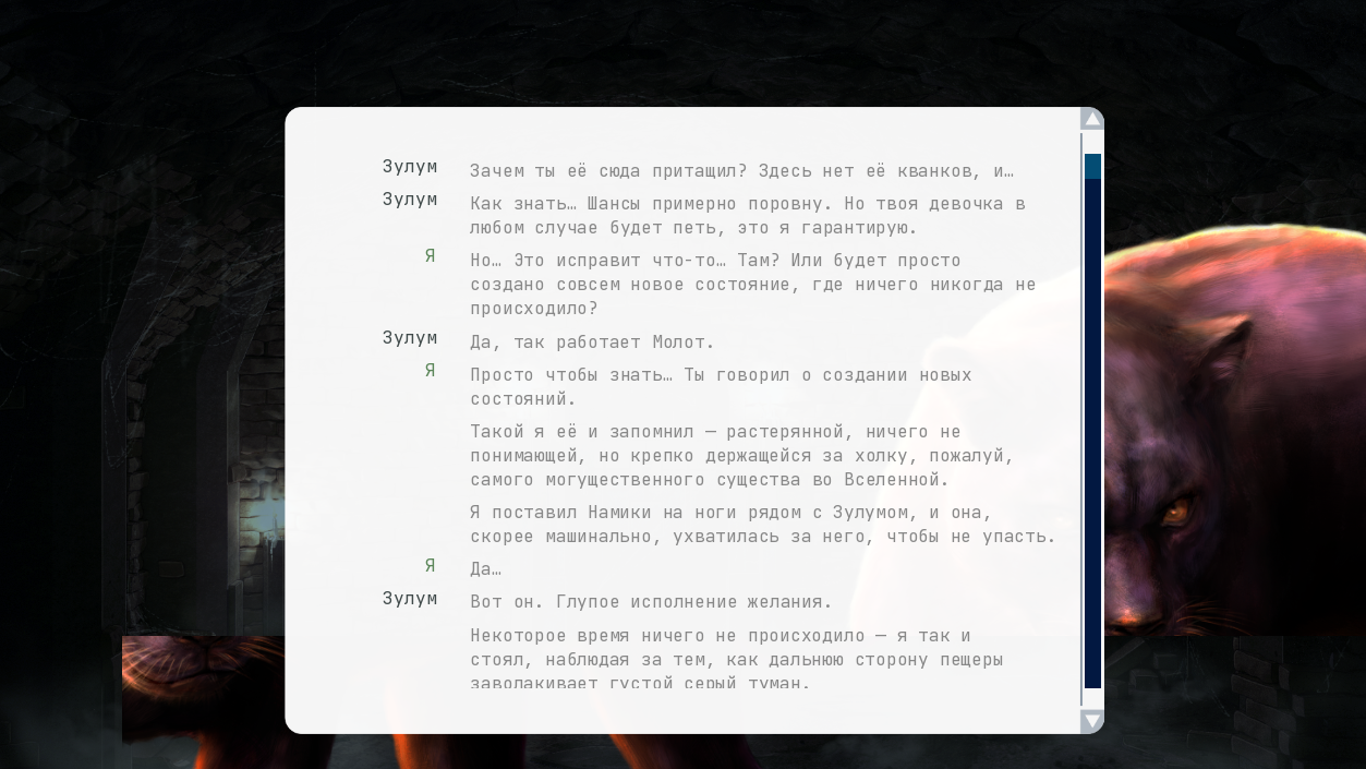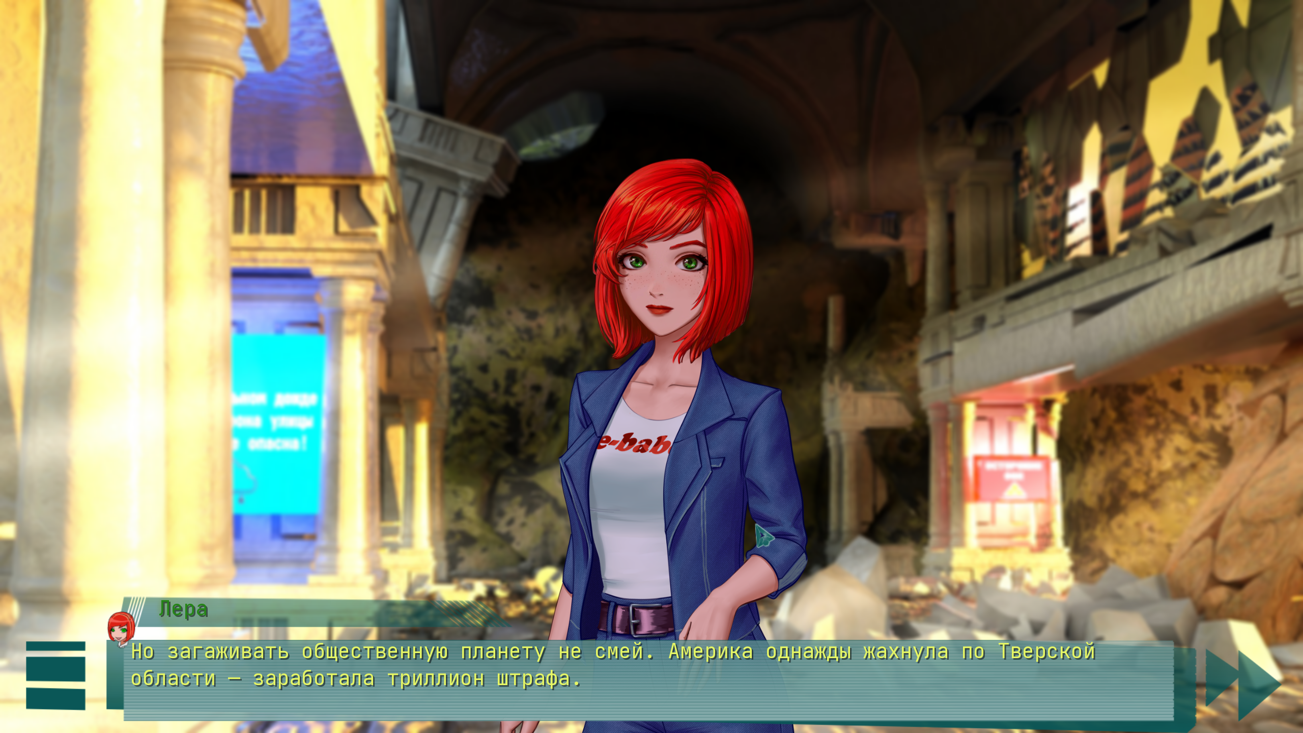lr "Самым главным и самым паскудным изобретением человечества были микро-ядерные заряды." me "По причине?" lr "Общественное мнение и финансовые санкции. Если ты с кем-то воюешь — это твоё личное дело." lr "Но загаживать общественную планету не смей. Америка однажды жахнула по Тверской области — заработала триллион штрафа." me "Стоп. По той области, которая ни с того, ни с сего увеличилась в десять раз?" lr "Как я понимаю, там сработало свёрнутое пространство, которое среагировало на бомбу." lr "Икарьев Геннадий был жертвой войны — на момент. когда он пошёл во второй класс в своём родном Моос Фестнунг, какие-то умы решили, что пора бы уже на Федерацию напасть." lr "Заодно и опробовали те самые МЯЗы." lr "Что забавно, создатель прототипа американского МЯЗа был сам выходцем из России, из-за чего в обе стороны через границу летали примерно одни и те же заряды." lr "Их преимущество в том, что обладая всеми достоинствами самой обыкновенной ядерной бомбы, они были лишены её недостатков вроде радиационного загрязнения." lr "На месте взрыва оставалось небольшое радиоактивное пятно с лёгкими изотопами, которые довольно быстро распадались." me "Быстро?" lr "Две недели." lr "Собственно, эти две недели и вошли в историю как Третья Мировая Война — все против всех, у всех есть МЯЗ, но ни у кого нет противодействия." lr "Война загоризонтной артиллерии, как её ещё называли." me "И всё, за две недели расстреляли боезапас и успокоились?" lr "Если бы. Просто через две недели у природы лопнуло терпение, и она ударила в ответ — сначала повышением среднегодовой температуры сразу на семь градусов, затем горящими лесами…" lr "Разумеется, это привело к таянию полярных шапок и повышению среднего уровня океана." lr "А ты не в курсе? Спроси у своей Намики, что это за такая Земля Горьких Слёз к северу от её родного Саппоро." lr "А, ты не можешь, точно. Ахха. А почему?" lr "Разве тебе не велели за ней приглядывать? Почему тогда ты здесь, а она неизвестно где?" me "Там… Долгая история. С котиками, кормушками… Электричеством." show lr laugh casualjacket with diss lr "Ах, котик." "Лера подняла голову к небу и долго, обстоятельно хохотала — почти как человек." lr "Какой же ты… Идиотик. Ты же сам хочешь, чтобы тебя обманывали, да?" lr "Электричество! Ой, умора…" "Меня чужой смех не пугал, но поведение робо-гида, то есть организма насквозь синтетического…" me "Скажи… А тебя никогда не звали Розой?" "Поинтересовался я." show lr normal casualjacket with diss lr "Так, это к делу не относится. Продолжим нашу экскурсию." lr "Так вот, у человечества не было бы и шанса, если бы к моменту начала контрудара природы оно не успело создать свой первый машинный разум." lr "Контрудар природы в истории остался как четвёртая мировая, а вот с машинным разумом всё было сложнее." me "Оцифровка." "Догадался я." me "Технологии тогда вряд ли бы смогли что-то путное сделать." lr "Правильно. Весь «маленький принц» превратился в прототипы будущих Сэмов — они и создали первый полностью синтетический разум со способностью к самовоспроизведению." lr "Тот создал второй, второй создал третий… Помнишь, как в Библии: Иаков родил Исава…" lr "Седьмое поколение Сэмов уже было достаточно гибким и мощным для того, чтобы представить человечеству первый прогноз." lr "На тушение лесов." lr "Политики мямлили что-то про экономическую нецелесообразность, но в Бразилии подняли на вилы правительство, после чего все прочие призадум