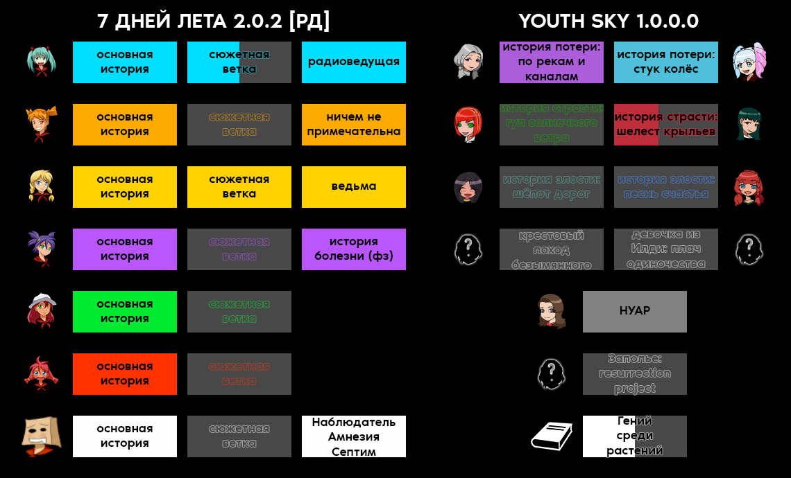 >>1155529 >1. Лана(Синий провал): полностью готовый рут с четырьмя концовками. 1989 год, Нулевой мир (тот самый, где происходят основные события 7дл). Главный герой оказывается на месте мальчика с одной неприятной странностью — он почти бессмертен, так как организм откатывает все изменения, полученные за сутки. То есть, его не берут болячки, раны и... взросление. Так что за ним приглядывает одна симпатичная девушка с грустным взглядом. Удачно или нет — узнаете в руте Ланы! >2. Намики(Стук колёс): полностью готовый рут с четырьмя концовками. 2080 год, мир Техсингулярности, всем заправляют машины и искусственный интеллект. Здесь уже не главный герой выступает объектом опеки, а наоборот. В месте, куда он попадает, все, кому нужно, прекрасно осведомлены и о нём, и о его способностях, так что подбирают работёнку как раз ему по плечу — нужно позаботиться об одной девице из-за границы. А как он с этим справится — читайте в руте Намики! >3. Стася(Шелест крыльев): первые пара дней истории девочки с суперспособностями, которые ей ну вот совсем не нужны. События рута развиваются на протяжении двенадцати лет, с 1988 по 2000 год и касаются больше главного героя, сама же Стася(здесь Сташия) появляется ближе к середине сюжета. Зачем главный герой нужен Стасе, и зачем она просит его стать душеприказчиком — узнаете уже совсем скоро! А пока затравка для интриги. >3. Ремастер Нуара: старый знакомый сюжет с чуть обновлённой графикой. 1991 год, Нулевой мир. В посёлок Радченко с расследованием прибывает этакий частный детектив советского посолу — "порученец", или специалист по особым поручениям. Вот только заказчик уже погиб, да и в Радченко творится какая-то чертовщина...