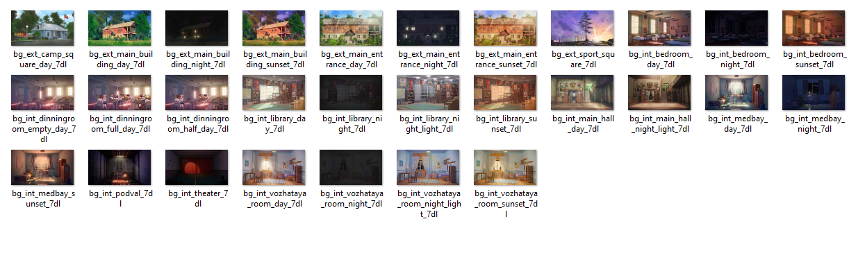 Что получается, отвечу я, пожалуй. В летосфере как нельзя удачно подвернулся подходящая графика: набор из фонов неразрушенного старого лагеря. Снаружи и внутри, с несколькими кабинетами (медсестры и вожатой), столовая, библиотека и спальня. Все эти фоны в нескольких вариантах в зависимости от времени суток. Всё это и прочее, по мелочи и крупнее, есть в летосфере и может свободно использоваться другими.