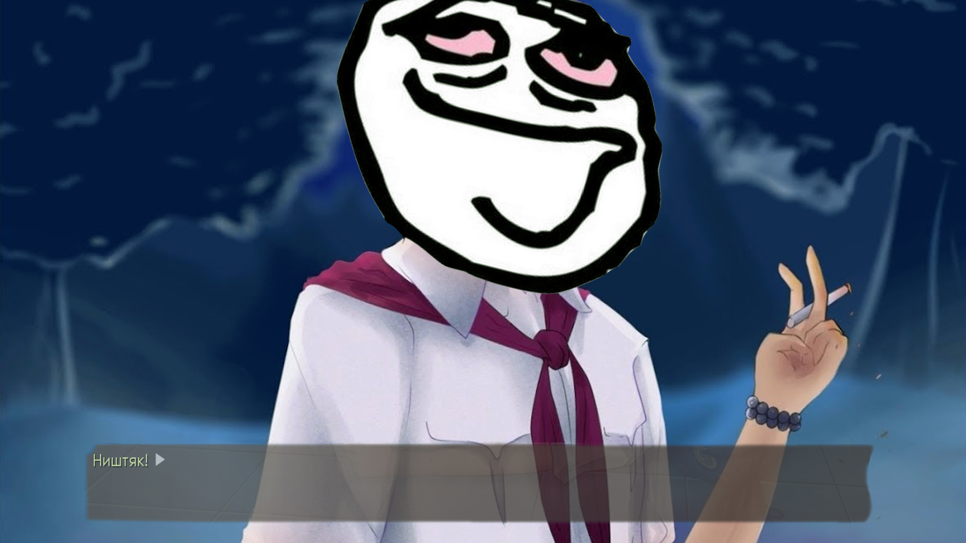 Дропал на: 1) Безумный секс-взгляд Ульяны 2)Какая-то стена текста хуй знает 3) Когда Санати свое чсв тешил. Ну, например, какую-то философскую хуйню высказывал, а пионерки им восхищались. Мол, вон как дает. 4) Когда водку начал искать чтоб Алису выебать. Похуй что в оригинале так же. Блевануть хотелось, так в душу насрали.