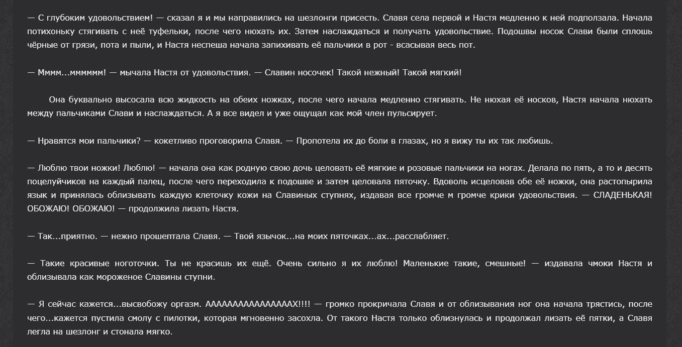 Славя уговорила меня остаться. Приятно было поваляться перед сном и поболтать о всяких интересных вещах которые случились в лагере за последние три дня. Как-то незаметно разговор зашел о Семене.. Я знала, что он ей нравится.. Это было заметно по тому, как она каждый раз краснела в его присутствии и без причины поправляла волосы. В какой-то момент Славя замолчала.. Я незаметно наблюдала за ней .. Из окна домика Ольги Дмитриевны звучала незнакомая мне и очень странная музыка.. Прошло пятнадцать минут . О чем ты думаешь, спросила я.. Славя вздрогнула, как бы очнувшись от задумчивости, затем рассеяно посмотрела на меня и сказала.. ТАК.. НИ О ЧЕМ.. и густо покраснела.