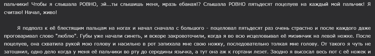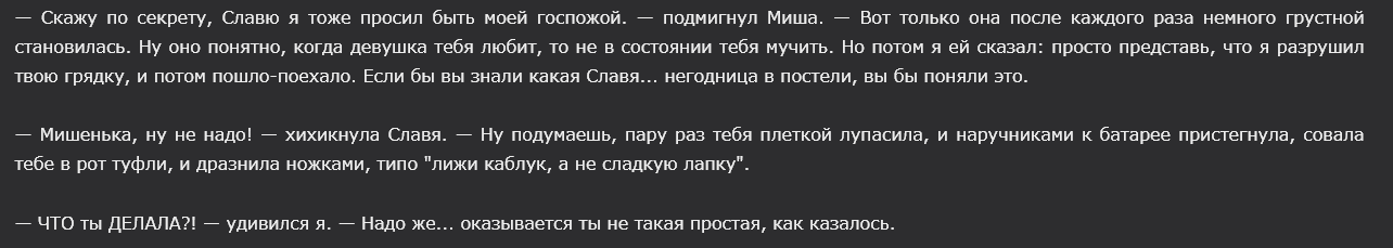 >>1168822 У меня это первый случай, когда я читаю настолько реальное пост"Совёнковское" произведение. Не надо ждать от него привычного уровня порнографии. Он нечто большее. И гораздо страшнее, так как приносит реализм в мечту.