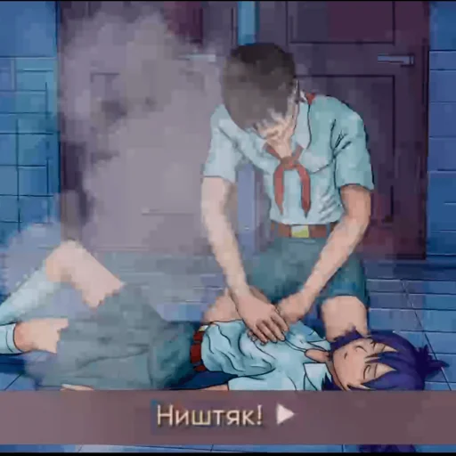 "Я громко зевнул и отвернулся." "Спать." stop music fadeout 3 scene black with fade2 pause(3) play music "<to 52.94>" + music_7dl["herc_death"] fadein 3 scene anim_digi show dreamgirl_overlay with dspr with vpunch with flash_red "Проснулся я от резко сработавшего чувства опасности." "Надо мной стояла Лена — такая, какой я её запомнил перед сном: в расхристанной рубашке, демонстрирующей грудь, в смятой пионерской юбке." "Я машинально отметил, что по внутренней стороне правого бедра сочится струйка из крови и семени вперемешку." "Но это не имело значения." hide dreamgirl_overlay un "Отец учил меня самбо, чтобы я могла защититься." if persistent.hentai_graphics_7dl: show un evil_smile body at cleft with dspr else: show un evil_smile modern at cleft with dspr un "От бандитов, воров." un "Насильников." un "Никогда не думала, что придётся защищаться от того… кого полюблю." "Я невольно проследил за тем, что она держит в руках." me "Постой, Лена!" th "Так это был не сон?!" "Она зло усмехнулась." un "Защититься." un "Или хотя бы отомстить." "В руках у девочки был молот из-под кровати Ольги Дмитриевны." "С пугающей последовательностью он взмыл вверх и отправился вниз."