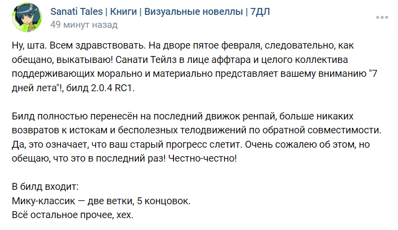 Хорошие новости, народ! Теперь вы можете следить за разработкой модификации здесь (ВК все равно спрятал статус в группе так, что я и сама его с трудом нахожу). Раз в две недели по пятницам будет выходить отчет о проделанной работе. Поскольку это первый такой отчет, сегодня вы увидите результат нашей работы за 3 месяца. В дальнейшем достижения будут выглядеть немного скромнее. Итак, перейдем к делу! Готовые ивенты в тексте: 14 Готовые ивенты в коде: 7 Всего страниц сценария: 112 Приблизительная готовность текста: ~30% Прошедшие стримы: 6 Новые CG: 5 Новые BG: 1 На сегодня это все. Stay tuned.