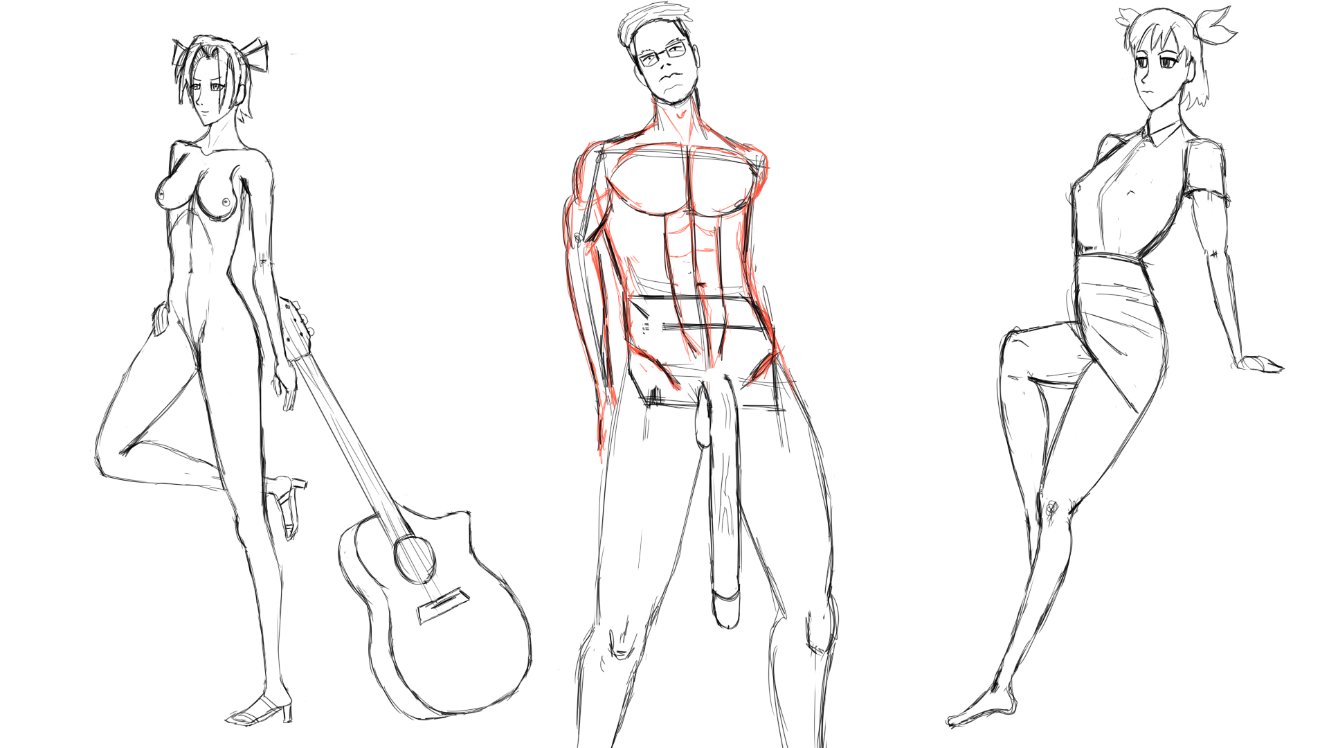 > Я так понимаю, каждое из этих действий это отдельное упражнение и имеет место быть, но меня разрывает от этого. А тут целиком все зависит от твоего желания, что именно ты хочешь подтянуть. Я например сперва набрасываю два круга, для обозначения массы грудной клетки и бёдер, а потом от них пляшу. Ты сам себе ставишь правила. Хочешь рисовать динамические позы, тогда добавляй линию движения и строй все вокруг нее. Я предлагаю начать с простого и работать только с изгибами тела, даже если получатся кривые уроды. Тут важно отработать навык вести линии любой кривизны, а не глазомер развивать.