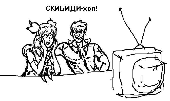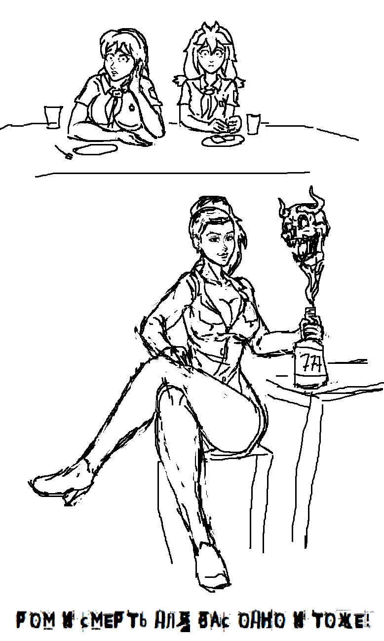 >>1214059 Столовая. Славя и Ульяна за столом пьют какао, недоуменно смотря на соседний столик. Следующий кадр, за соседним столиком сидит Виола, наслаждается стаканом портвейна "777"