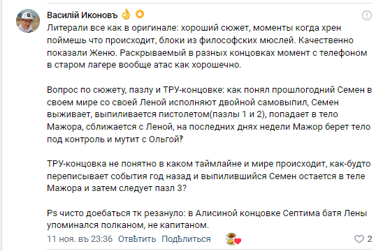 По сл7дл: Во флешбеке со вскрытой Леной в 6 дне сл7дл проёбана режиссура. Помню, что когда эта сцена была ещё в классике там всё было сделано по уму(длинные волосы у Лены, зимняя куртка на выписке), сейчас там будто старый пивиевский вариант где всё время пионерский нормал спрайт Лены.