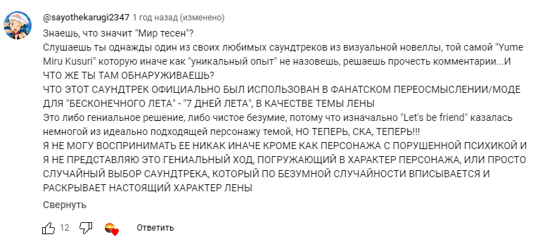 Ветка-концовка-Дрища видно что "главная" по зумерской морали, по длине текста, так и по вложенному в неё бюджету. И мне она тоже понравилась больше всех, но печалит тот факт, что Катя никак вообще не обыграла в сценарии то, что та самая Лена то нихуя не умерла, она в ФЗ руте чиллит в медпункте Виолы. Понятно, что если бы это стало известно Дрищу, то зумерская мораль бы посыпалась, но концовка-2 в эту ветку просится, если учесть, что Юля в этом руте умеет всё и даже больше.