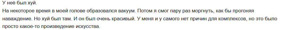 Послушайте, анониксы. Всем фикрайтерам на заметку. Если пишете дохуя драматичное пиздастрадальное произведение, то для добавления дополнительного плак-плака сделайте так: по возвращению в родной мир из Совёнка Семён начинает постепенно забывать всё что произошло в лагере. Не так, как забывается какое то жизненное событие с годами, а скорее как забывается сон. То есть, после пробуждения помнишь его ярко, потом постепенно воспоминание выветривается, выветривается, и через пару дней ты его полностью забываешь. И Semen все это чувствует и пиздострадает от этого. Записывать произошедшее во сне на компуктер или на бумагу тоже не вариант. Во первых Semen не писатель, он не сможет красочно передать все произошедшее, а значит многое все равно будет забыто. Плюс, он скорее всего не успеет, ибо детали забудутся довольно быстро (те, кто когда то пытался записывать свои сны после пробуждения ото сна - поймут меня, остальным думаю будет не так трудно представить). Правда, это наоборот можно посчитать хорошим исходом. Ведь он не будет помнить, как хорошо ему было, а еотом и вовсе забудет про этот лагерь
