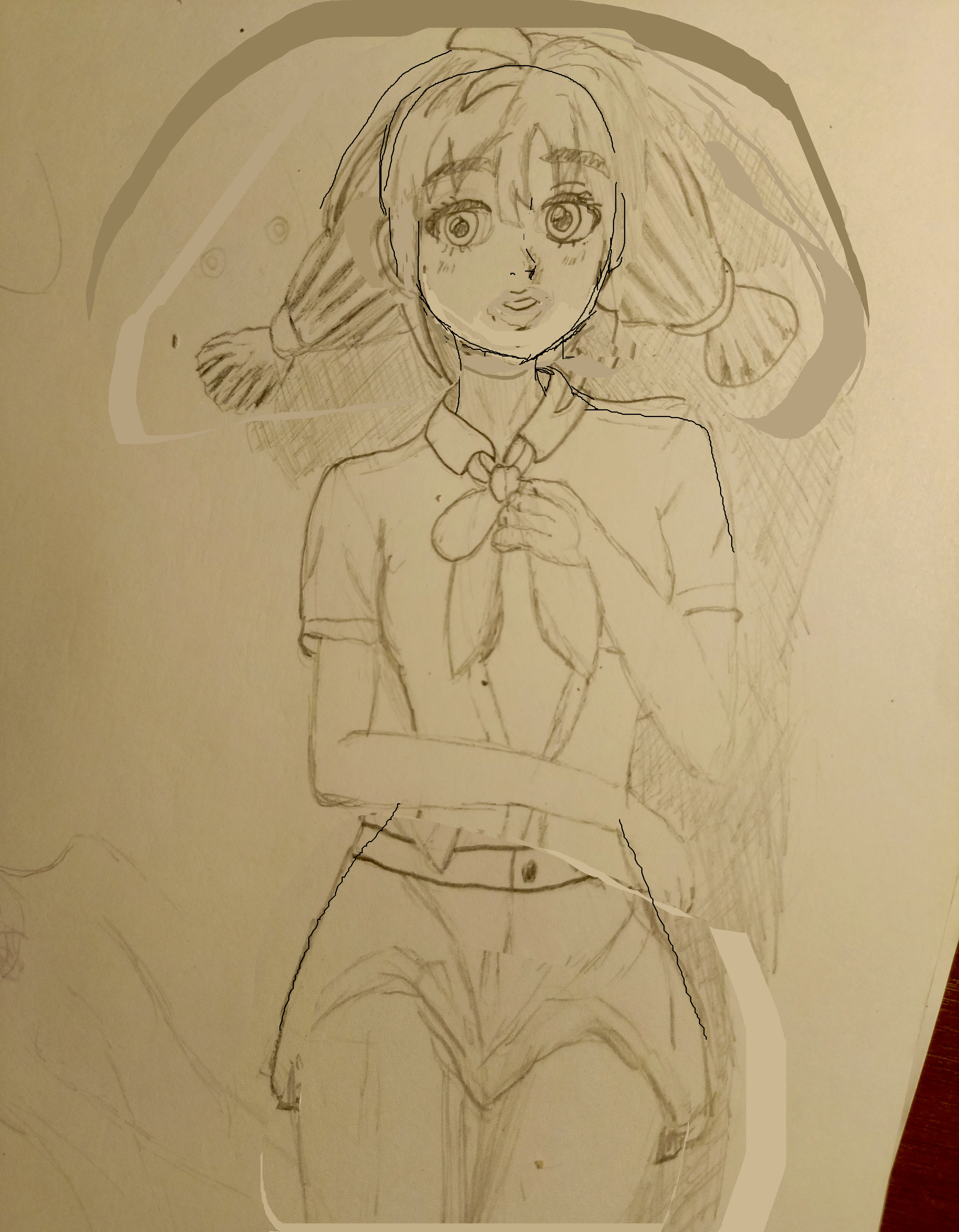 грудь я как-то не смог выделить, будто плоская, правая коса получилась чуть ли не в два раза больше левой и я заметил это только в конце. Ноги дорисовывать не стал, ну и руки. И шорты, я сначала хотел чтобы они лежали, как на референсе, а получалось будто они объёмные, крч тоже не получилось забил. В общем буду учиться