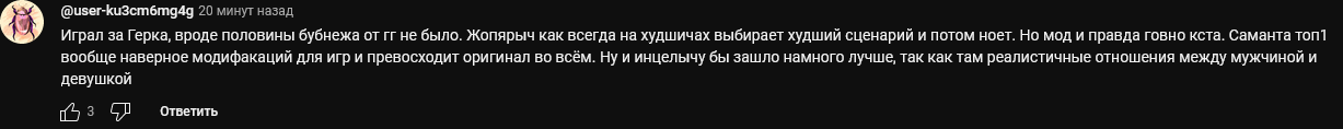 Классный мод, круче саманта мода. Ну отчасти. Решил пройти после дропа попичем. Прошел на хорошую концовку 14.1 Ульянки семище. Датфил, кайф. Если бы держал носрам, бабочки в животе были бы обеспечены, но я их похертил себе. Ща еще на огоньки тай-тай пройду. Даже пропало желание ркн делать от одиночества и недотраха, текст на порядок лучше оригинальной сюжетки ритана. И это писал тот же автор что и жизосон с кучей воды про войнушку на чердаке медпункта?