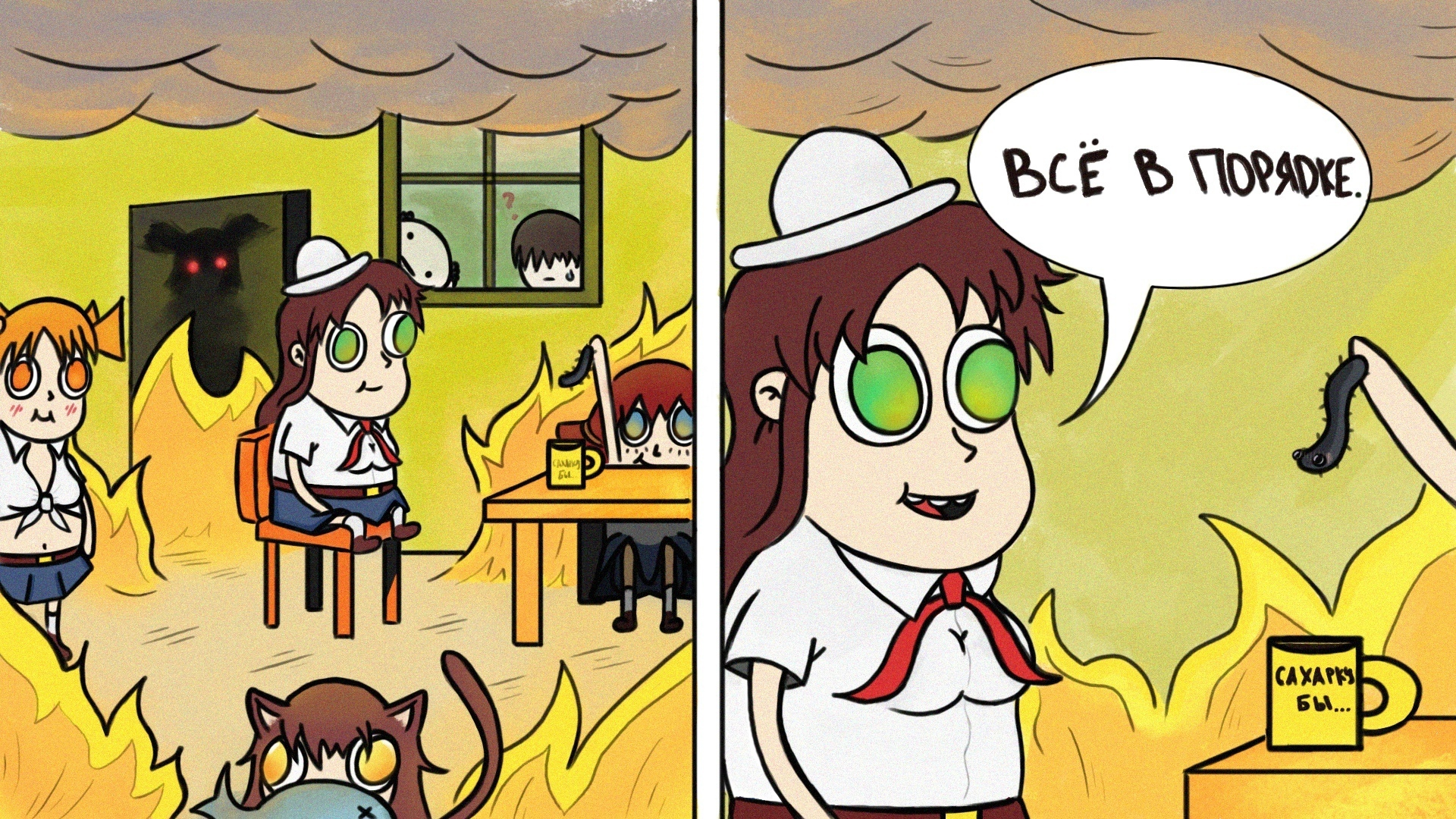 Продолжаем обсуждать вожатую. Предыдущий тред >>493235 (OP) Так как прошлый тред висит с 2015 года, то маленькая справка. По диздоку ей 23 года, Семену показалось, что ей 25. Единственная, кто не смущается при виде голого Семена. В процессе написания трижды менялся цвет глаз: с красного на карий, а потом на зеленый. Прототип ОД - Мод-тян с ычaнa, но под кроватью у неё банхаммер - атрибут Банхаммер-тян а это два разных маскота Значок на груди у Ольги, предположительно, Знак выпускника высшей школы милиции. Вожатая Ольга из Metro:Exodus - отсылка на ОД. Погнали.