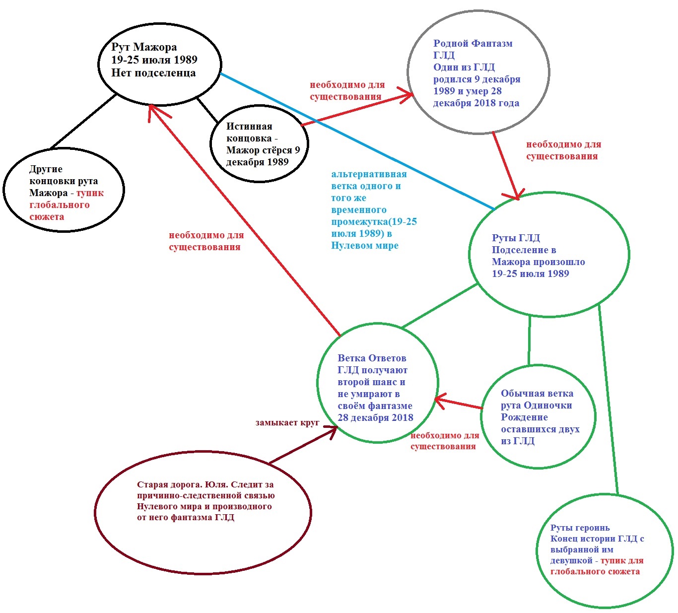 Алсо, я не вполне уверен насчёт формулировок "тупик глобального сюжета на схеме". Я не думаю, что воля Мажора в труэнде была направлена на создание вот прям бесконечного цикла. Окей, мне ещё до финального рута долго читать - но с какой целью Мажор создавал ГЛД? Для какого счастья? Для счастья в своём фантазм по итогам тру-концовок или для счастья в нулевом с феодальшей?