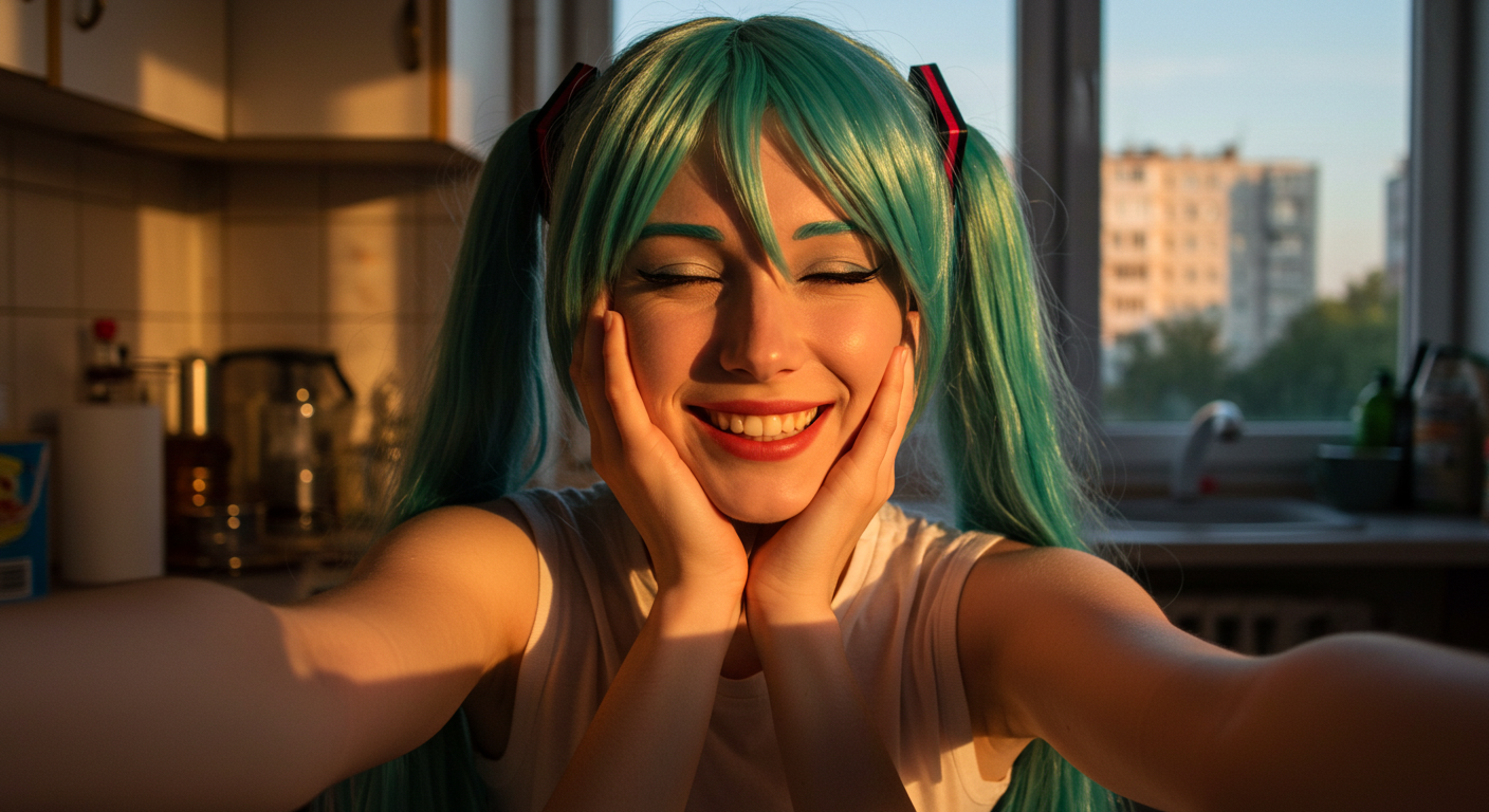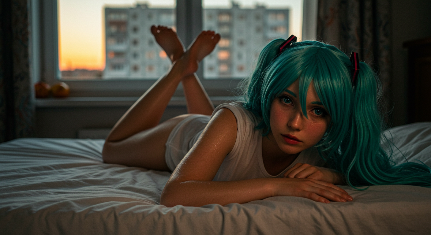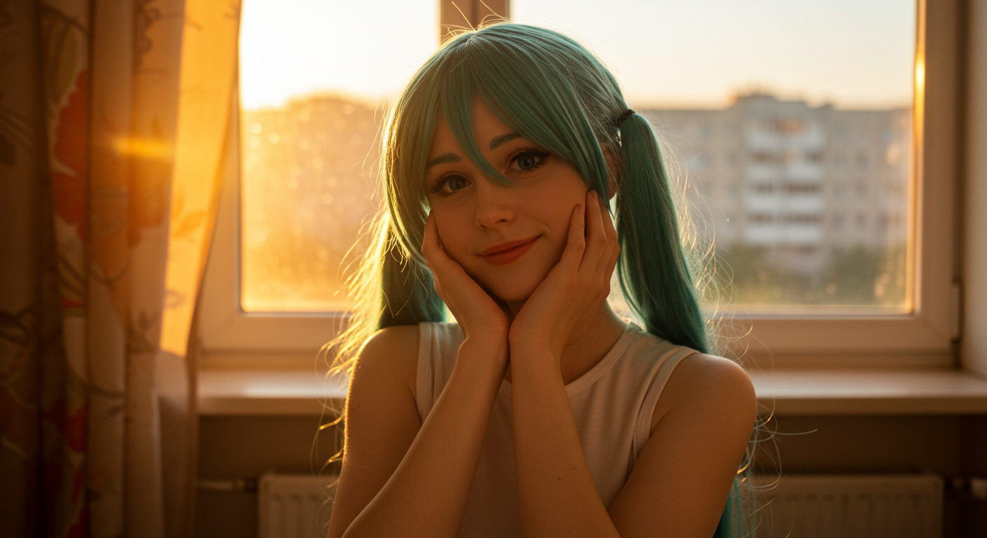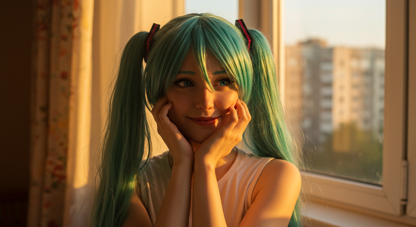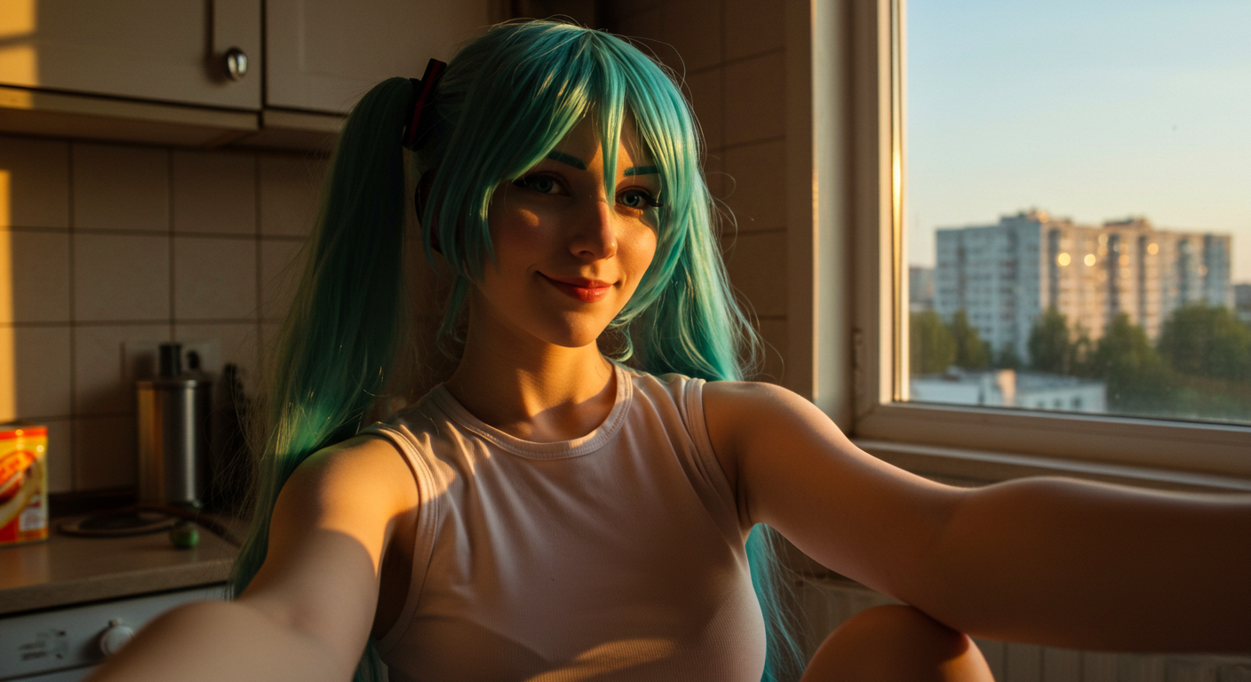 >>1253304 real person Hatsune Miku, white tight sweaty t-shirt without sleeves, 1990s photo, 35mm film, She is gently placing her hands together in front of her face, with her eyes open in a peaceful, content expression. The scene is bathed in warm, soft sunlight coming through a window, casting a serene and cozy atmosphere, shy pose, blush, smiling, happy, summer, sunset, orange strong rays from the window, atmospheric lighting, post-soviet high-rise panel houses over the window, 1980s soviet apartment, warm filter, lens flare, light rays
