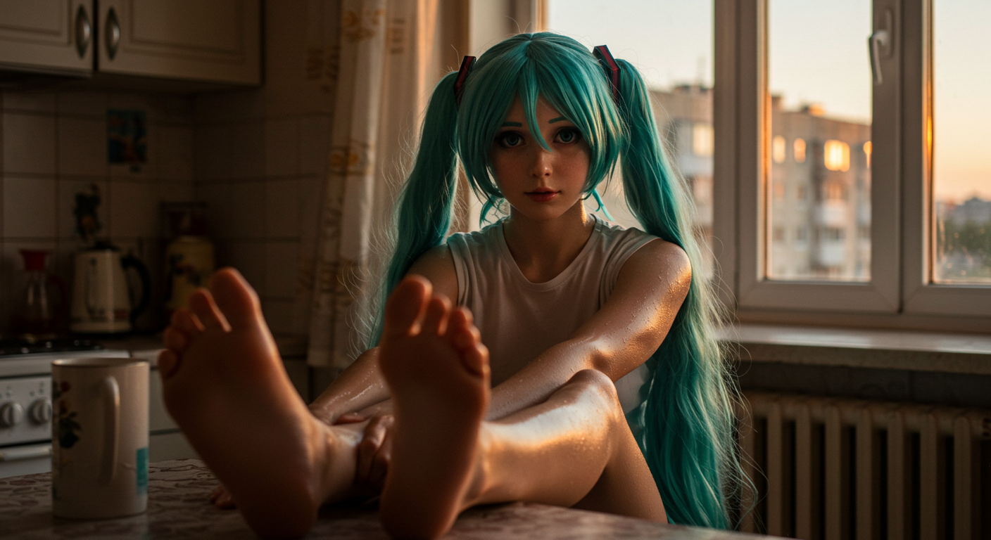>>1253176 real person Hatsune Miku, white tight sweaty t-shirt without sleeves, 1990s photo, 35mm film, sweaty, sweaty feet focus, sitting in kitchen, feet on table, looking at the camera, shy, blush, hot summer, sunset, orange strong rays from the window, atmospheric lighting, post-soviet high-rise panel houses over the window, 1980s soviet apartment