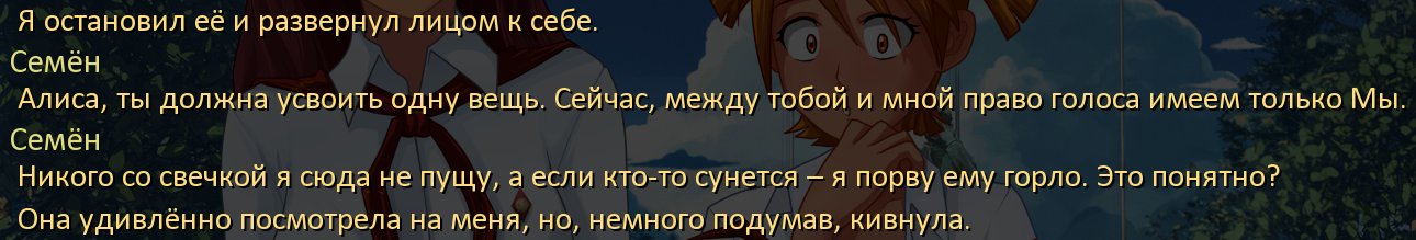 >>1255830 Авторы "наслаждаются графоманией", а я вот не очень. Мне интересны персонажи, их чувства, реакции. А читать объяснения неканоновых сюжетных переплетений такое себе. Можно придумать сотню способов, как Семён попал к Славе в параллельный мир. Например его укусил просветлённый комар и Семён в миг достиг Самадхи, научившись перемещаться по мирам. Вообще не имеет смысла как и что. А вот характеры персонажей это канон и они сделаны великолепно! Просто на 11 из 10! Вот это самое ценное, а не ебучие часовые разговоры с пионерами про бутылочку там, концертики (которые в руте Слави, в отличие от рута Мику, нахрен не нужны имхо) и всякую отвлекающую хрень абсолютно никак не влияющую на сюжет. Ну или почти не влияющую. Авторы конечно молодцы, что написали столько текста, лучше так чем никак, но не для меня. Во время базара пропадает атмосфера и уже не чувствуется настроение. Я заметил что крупные моди этим страдают, то есть читаешь читаешь такой, а потом ХОБА и начинается вообще не по теме какието качели. Может сценарист меняется, может кусками сценарий копипастят для чего-то. Ну чувсвтуется. Отлекает. и тут приходит на помощь его величество СКИП. зажал кнопку и ты уже снова погружаешься в что-то значимое...