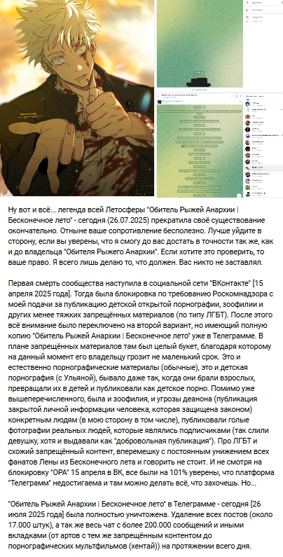 >>1255846 Город палить не буду, но если тебе очень нужно, то сам найдёшь. А если ты имеешь в виду виртуальное место, то... Ну, как бы сказать. Его паблик, посвящённый багьбе с летосферой, недоступен на территории РФ. За постинг ЦП. Да, у персонажа, который получил по шапке от РКН за цопу, хватило наглости и тупости накатать на кого-то заяву.